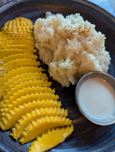 Wow, wow, wow... Thai is my favorite food and my hubby is hard to please, we were both very pleasantly surprised by everything at this place! We sat at the bar and Rudy and Kurt were so friendly and made us delicious cocktails, catering the drinks to exactly what we asked. We went for the food but the drinks were honestly so delicious and only $14 or so each. Now, the food... I'm sorry I didn't take pics until we got to dessert but honestly, it was so good I forgot about my phone (and the chopsticks) and destroyed everything! We started w the chicken satay and although it was classic in the sense of skewered chicken thighs, peanut sauce and a mini cucumber salad, it was truly delicious, tender chicken, savory sauce and a sweet little crunch w the salad. Then we had the 3 color curry and the short rib fried rice as they were the most recommended. The curry only comes one spice level but we added from the spice rack and it was such a perfectly flavored dish, we LOVED it! We ordered the fried rice w a spice level of 4 (fried egg on top) and it had Thai chili's, the perfect spice/flavor for those who can handle it, arguably the best fried rice we've had. I don't want to over hype this place because expectations are everything, so maybe go into thinking you're going to an average Thai spot, but I promise you won't be disappointed. I'm only sorry we didn't have more people with us so we could try more dishes. Good news is we'll have to go back! My neighbor had some drunken noodles that looked fantastic and we heard the waterfall beef is amazing too! Ohhhh how could I forget dessert, the only thing I got a pic of, the sticky rice and mango was done perfectly, the rice was hot and the mango was sweet. We couldn't have ended the meal in a better way. Cheers to finding great food with amazing, friendly service for a very reasonable price for Vegas! Cannot...