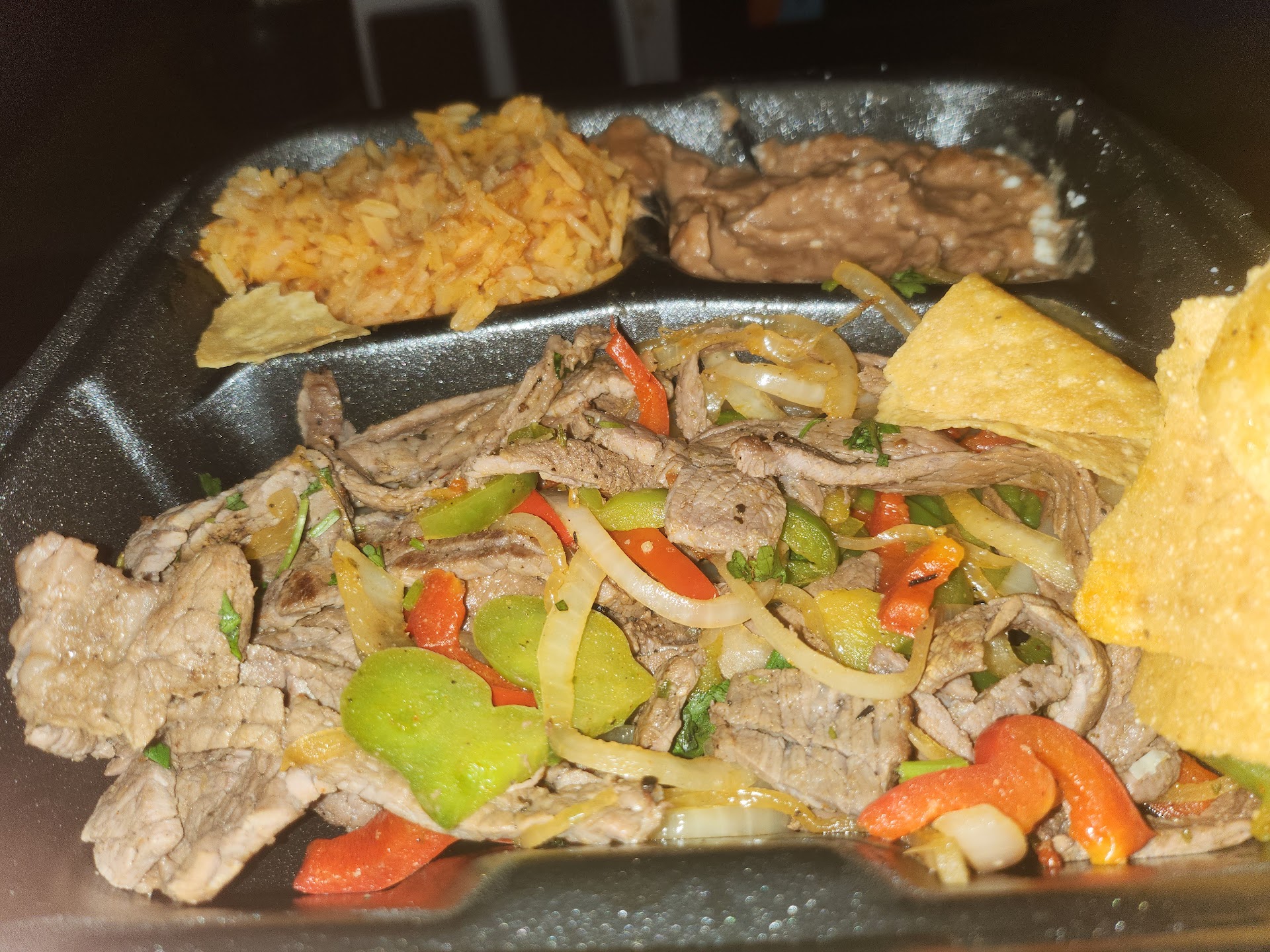 The retried beans were like bean soup instead of retried beans. The tortilla chips that came with the food were not crispy, they were stale and cold.