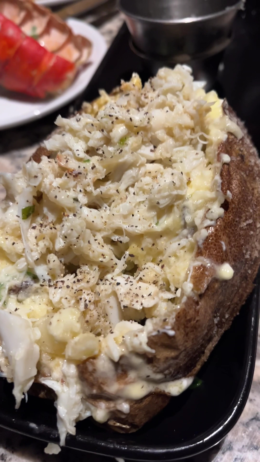 I had a nice ribeye steak bone in with a loaded baked potato, and I had them to add a side of lump crab to that baked potato, which was great. I am. I told them they had the name this particular dish the loaded Lump crab baked potato by Mr Cooper that’s what I had the steak and I also had a lobster tail. It was a 4 ounce lobster tail ordered the steak medium well once it came it was great. The steak tasted fine. It could’ve been a little more seasoned the lobster tail. I had to take back because it was steamed, but it didn’t taste right so they took it back and then I asked them to put it in the broiler so when they made a new one and they bought out another one and it was OK as far as the lobster tail, it was so small you know so I give that a 3 out of 10, the steak I give a 7 out of 10, but as far as the loaded baked potato, it comes with all of the things you would think a loaded baked potato comes with kibes butter, sour cream, bacon, bits that works, but when you add a side of lump crab meat, you get the Mr Cooper loaded lump baked potato 10 out of 10 for sure. The other things that I can say about it with their dinner rolls, their dinner rolls are super. They’re the best thing on the menu the dinner rolls get a 10 out of 10 we were topped off with great dessert Where they spelled my name wrong but the dessert was great. Nonetheless, I had A slice of chocolate cake you’ll see in the photos. It takes as good as it looks, but all in all it was a great way to spend my birthday. It was a great way to spend it with my sons and my business partner and celebrate the wins and celebrate the reasons why we were out there. If you’re ever visiting Las Vegas make sure you stay at the Strat and also make sure that you attend McCalls Heartland Grill all in all I give McCalls a eight out of 10, Mr Cooper certified