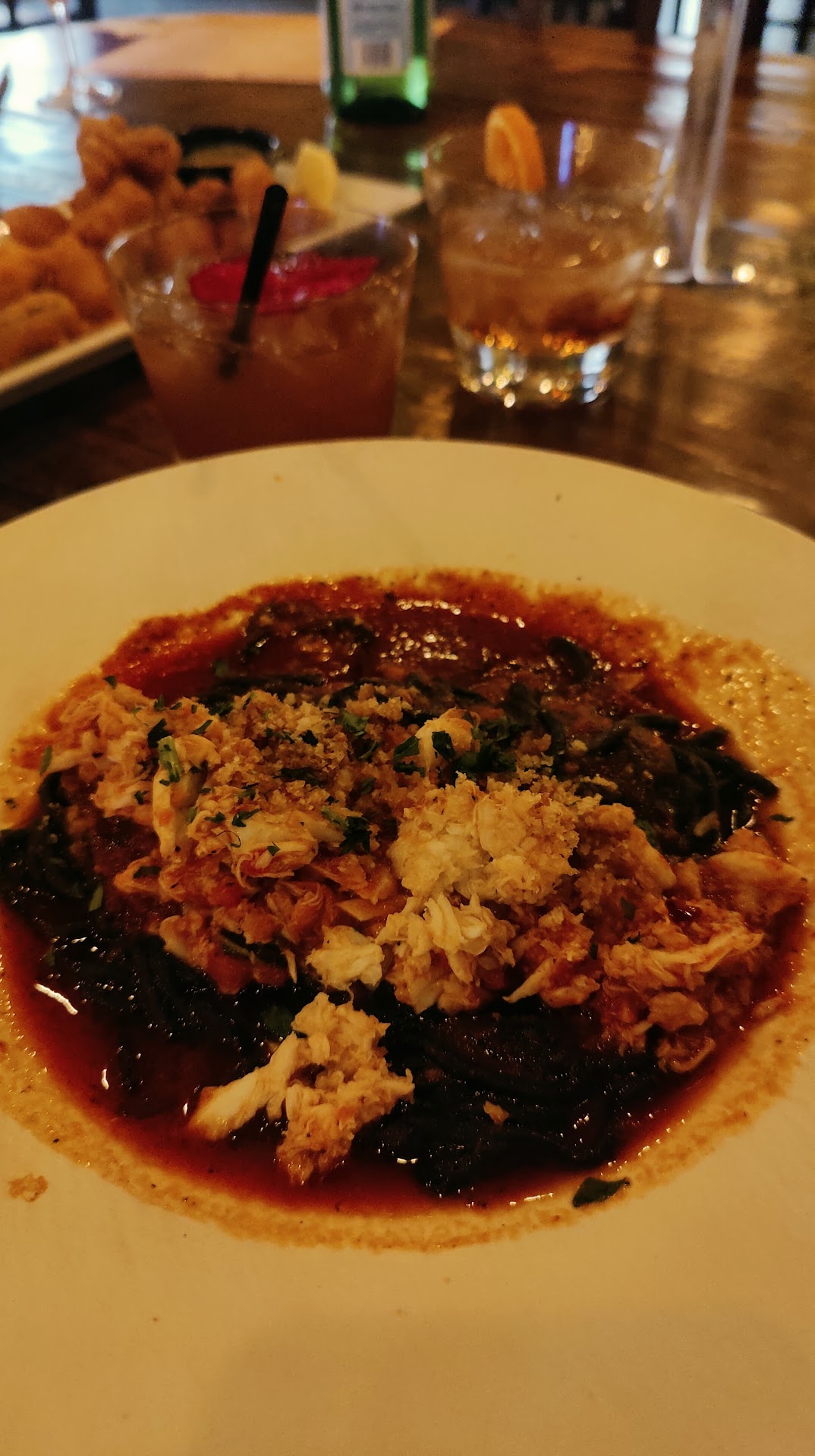 Using a mix of robots and staff to serve, though the counter utilizes Ahern’s culinary team, course one offered a Beets and Burrata Salad followed by Spanish Octopus a bit overcooked alongside crispy Potatoes.