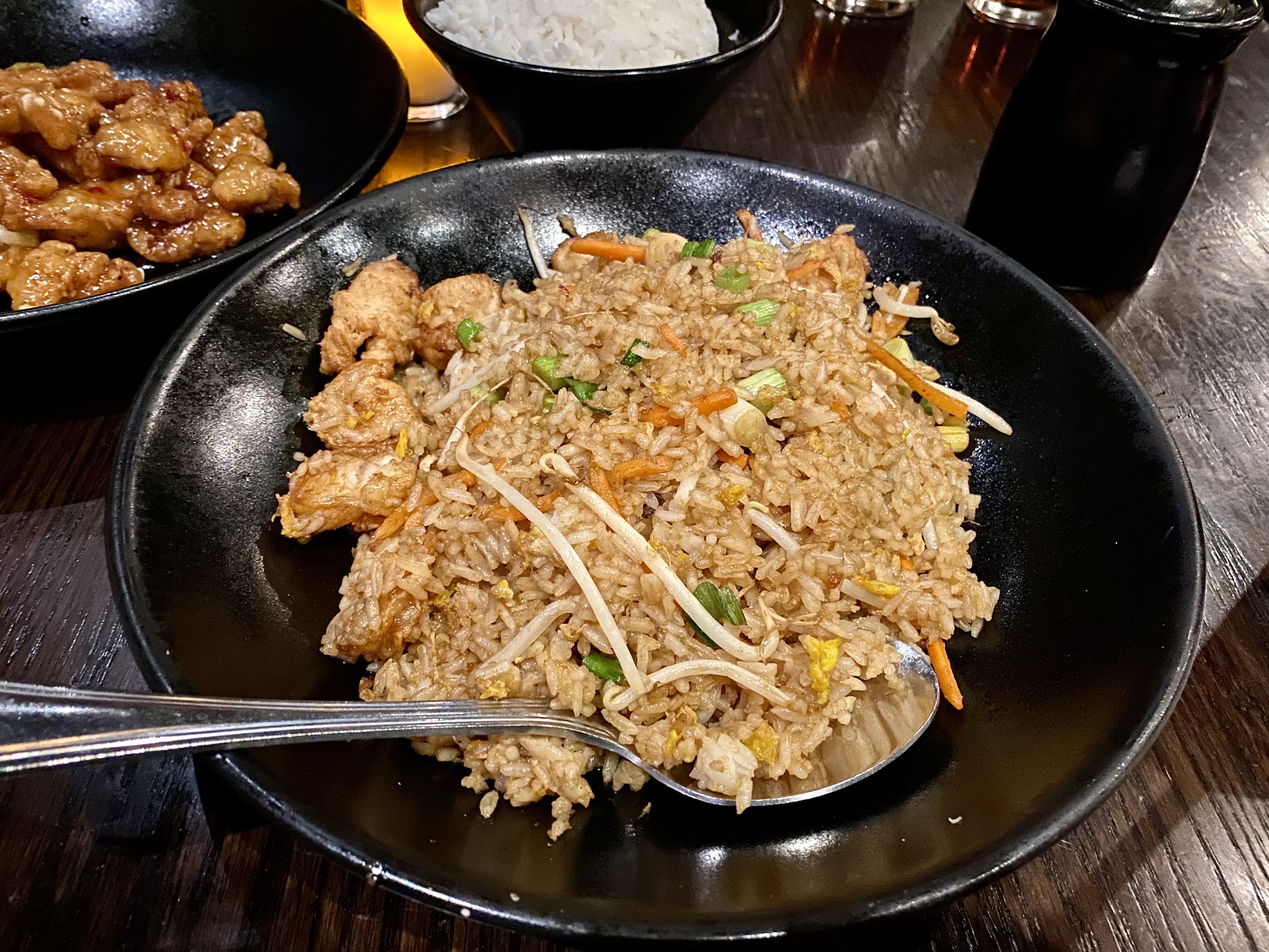 The first time they brought out our Fried Rice it was Shrimp Fried Rice and we ordered Chicken Fried Rice since I don't eat seafood. We waited a few minutes for the new bowl , but began eating the main entrees with the white rice so our food didn't get cold. The Chicken Fried Rice was the only dish that seemed the appropriate size for an Asian restaurant. The Lettuce Wraps were also a good size portion and the Crab Rangoon was 6 pieces. My son and daughter in law liked them. The bowls of white rice that they brought out for each of the 2 entrees was like one handful each ! Also my son ate the Cheesecake the next day and said he gave it a 2 out of 10 and he loves cheesecake.