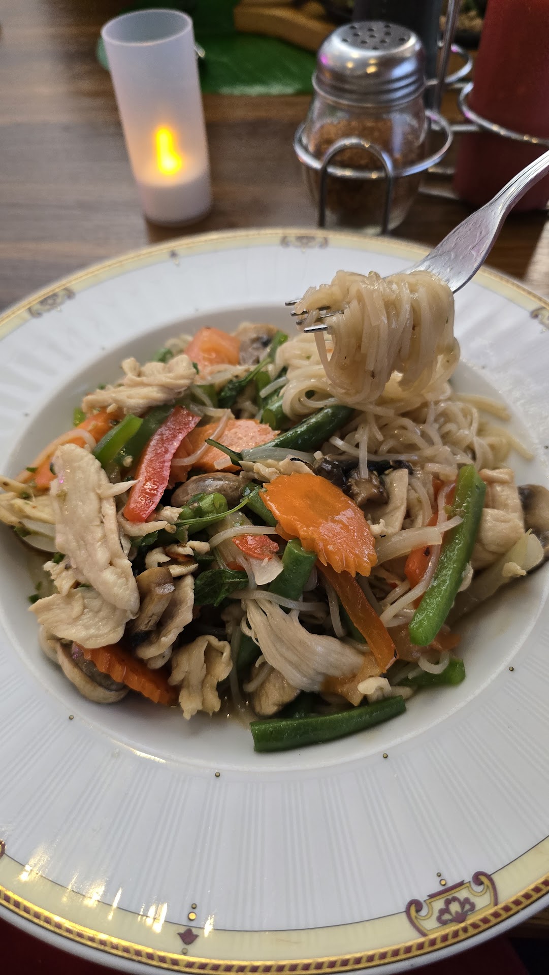 I was soooooo annoyed when my $15 chicken pad kee mao came out with gluten-free spaghetti. I literally buy gluten-free flat rice noodles at the Asian grocery stores in town. Are you telling me a Thai restaurant owned by a Thai person with Thai staff can only get Italian noodles that are gluten-free? The sauce tasted fine but the texture wasn't right because of the spaghetti.