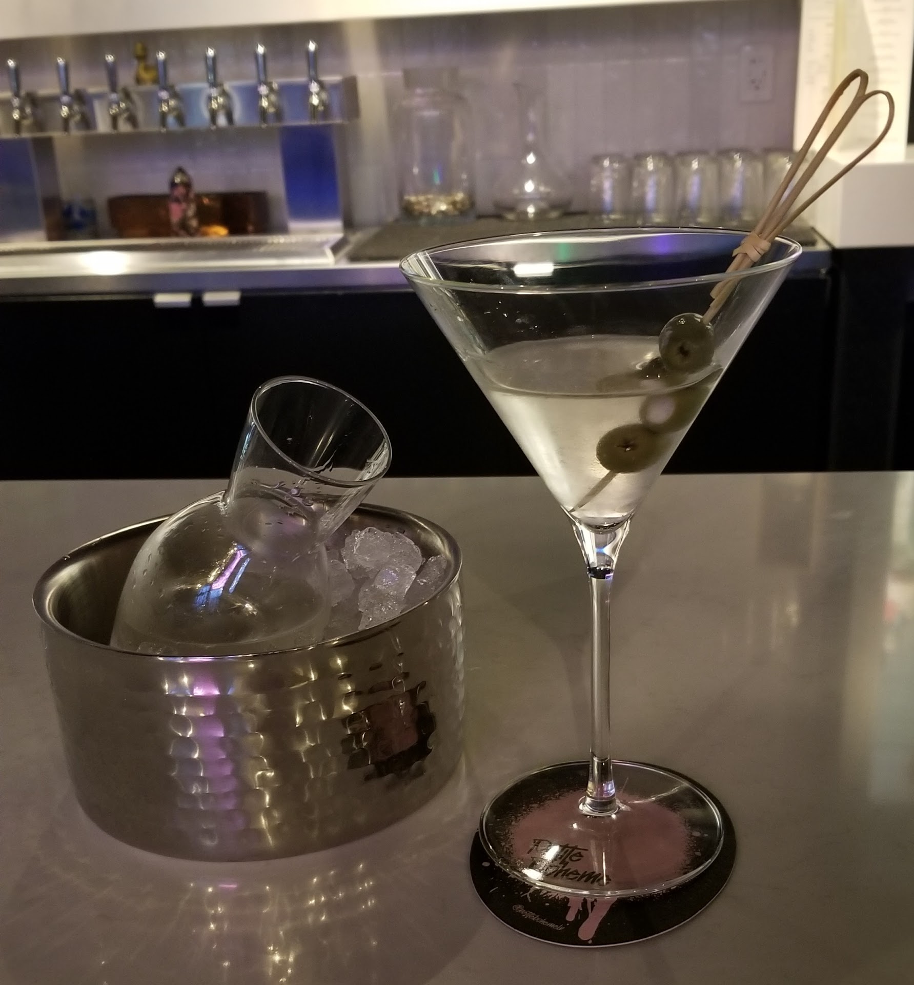 (Build-Your-Own) Martini ($26): Plenty of options. Karla basically held my hand to make the best choice suited to my tastes. Got the Highground vodka, dirty, with blue cheese olives as garnish. Served ice-cold and tasted delicious. As the menu noted, the on-the-surface hefty price included a sidecar; I estimate the total volume could have been around two-and-a-half cocktails.