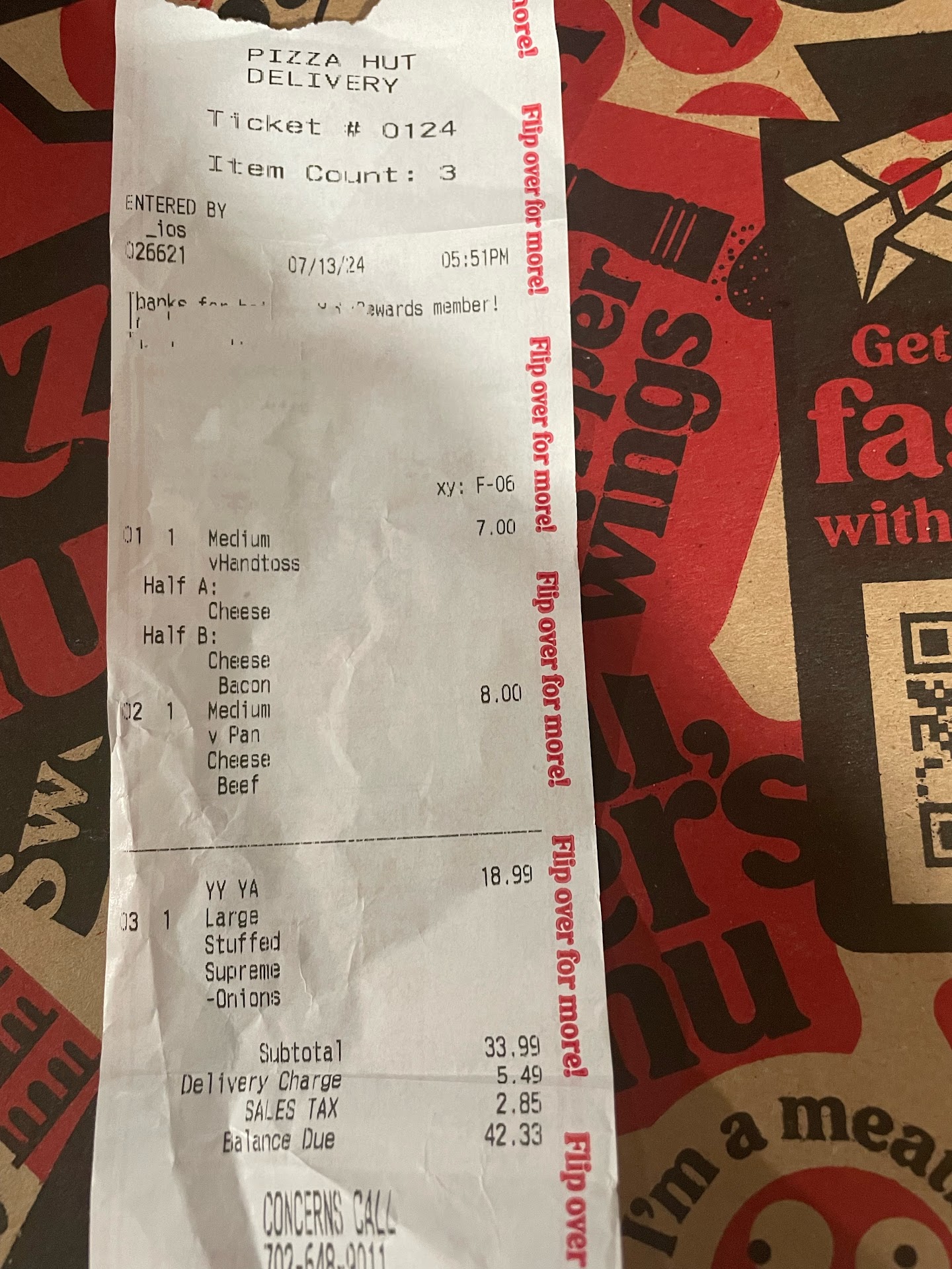 Read moreI ordered a 5 topping pizza online .gave me a 20 % discount..withe order..order paid for...when delivery guy got here..they wanted extra money for the discount that did apply online but not in the receipt..and missing a topping as well...the delivery driver called the store and Manager Laura. Store #026621.in N Las vegas..lake Mead and jones...was rude omg..says no discount when you order a deal..so asked why did it charge me with the discount online..I would have paid the difference if it was..she didn't want to take ownership of website glitch..told the driver to take my pizza back..I paid the extra..without noticing my missing topping...then called the store. Another worker answered..told them I was missing a topping..put me on hold for manager .but Laura had to be the only manager ..left me on hold then she hung up the phone on me..reporting this horrible service to BBB and won't be back..all these years I've shopped at this store...Laura rude and combative towards customers..bad business period..hope she...