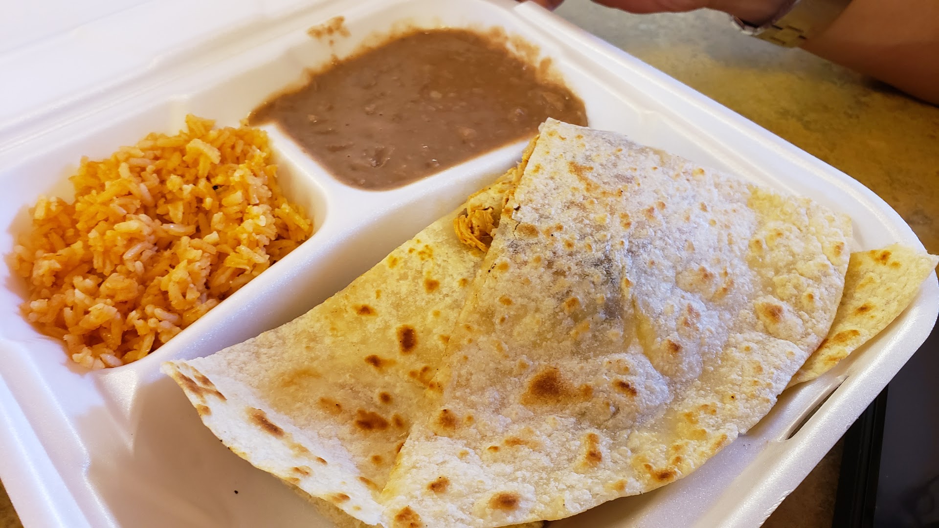 -2 pieces of chicken (wing+breast or leg+thigh) -Beans -Rice -A little bit of lettuce, tomato's, onion (small portion) Tortillas Salsas
