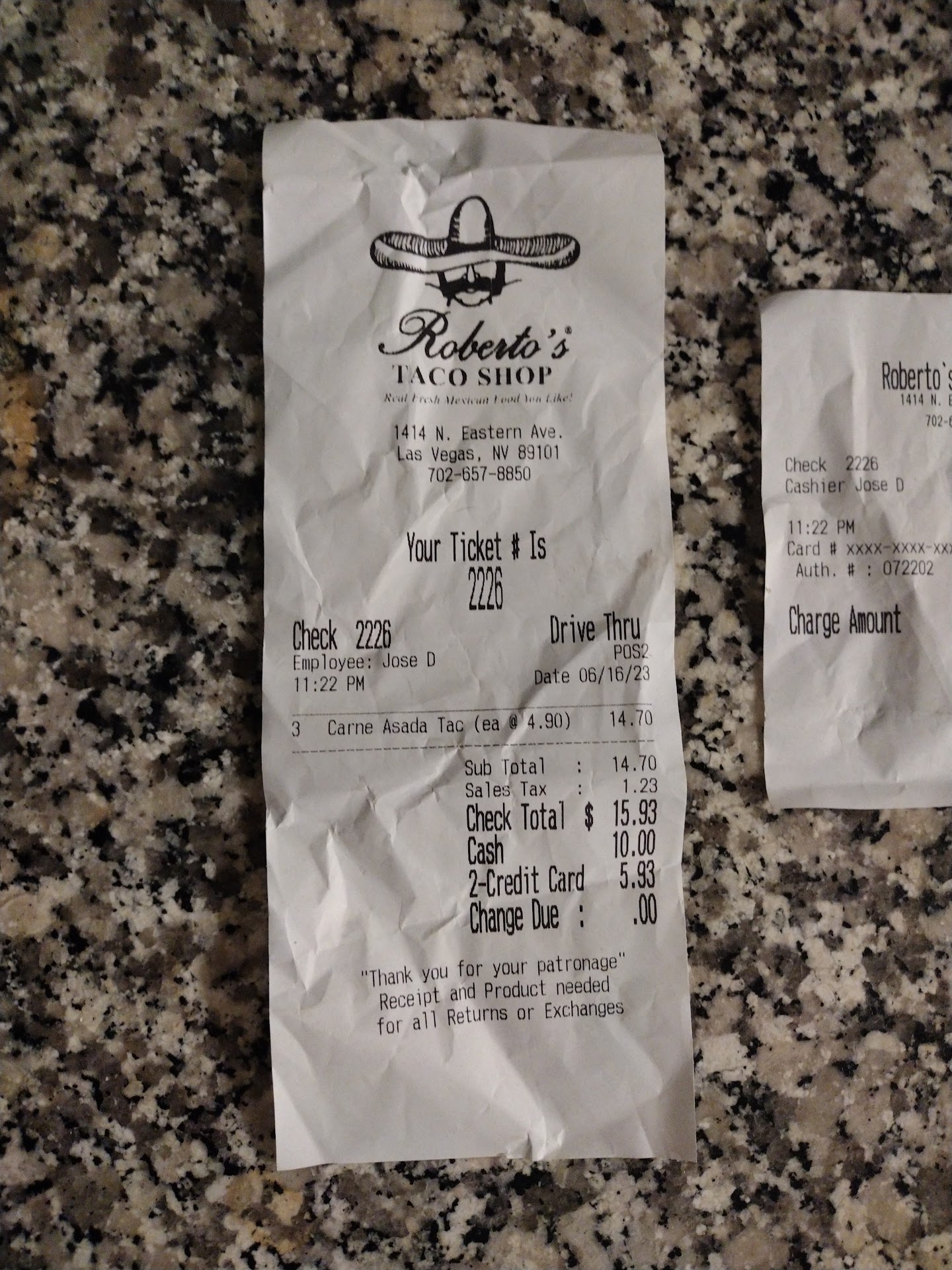 Read moreI go to Roberto's for one reason, it's the "Carne asada Burrito". I've been a customer since I was 12 yrs in San Diego, at the time Roberto's was only located in Southern California. Understandably, the price of menu items has all increased. Being a very popular item, is why the Carne asada Burrito price has increased so much more. That's probably the reason why the issues I do have have sting a bit more. When I order a Carne asada Burrito I never know what I'm going to get. The consistency is all over the place. Sometimes having the¬ driest meat almost to the point of being beef jerky; grisly meat where no matter of chewing will break down the meat to be swallowed; the newest constant issue has been an off-putting taste and having a burrito that you can't differentiate the items that are inside it. I have been ordering through food delivery service alot lately but that's no explanation. During the last 2 months I've purchased and drove my orders home myself and for the second time this year, I took two bites and the burritos went into the trash. OTHER than that, when the Carne asada Burritos are...