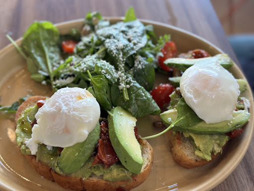 My girlfriend kicked off her meal with the tangy Blood Orange Mimosa, a perfect precursor to her main dish, the Bravado Toast. This toast, made from rustic bread crisped with olive oil, was lavishly spread with smashed avocado, a special red onion honey jam, and sun-kissed tomatoes. The pair of sunny-side up, cage-free eggs provided a creamy contrast, and a dash of Maldon salt brought out the essence of the dish. Accompanied by Dijon citronette, spiced pepitas, and greens dressed in Parmesan, it was a hearty yet refreshing choice.