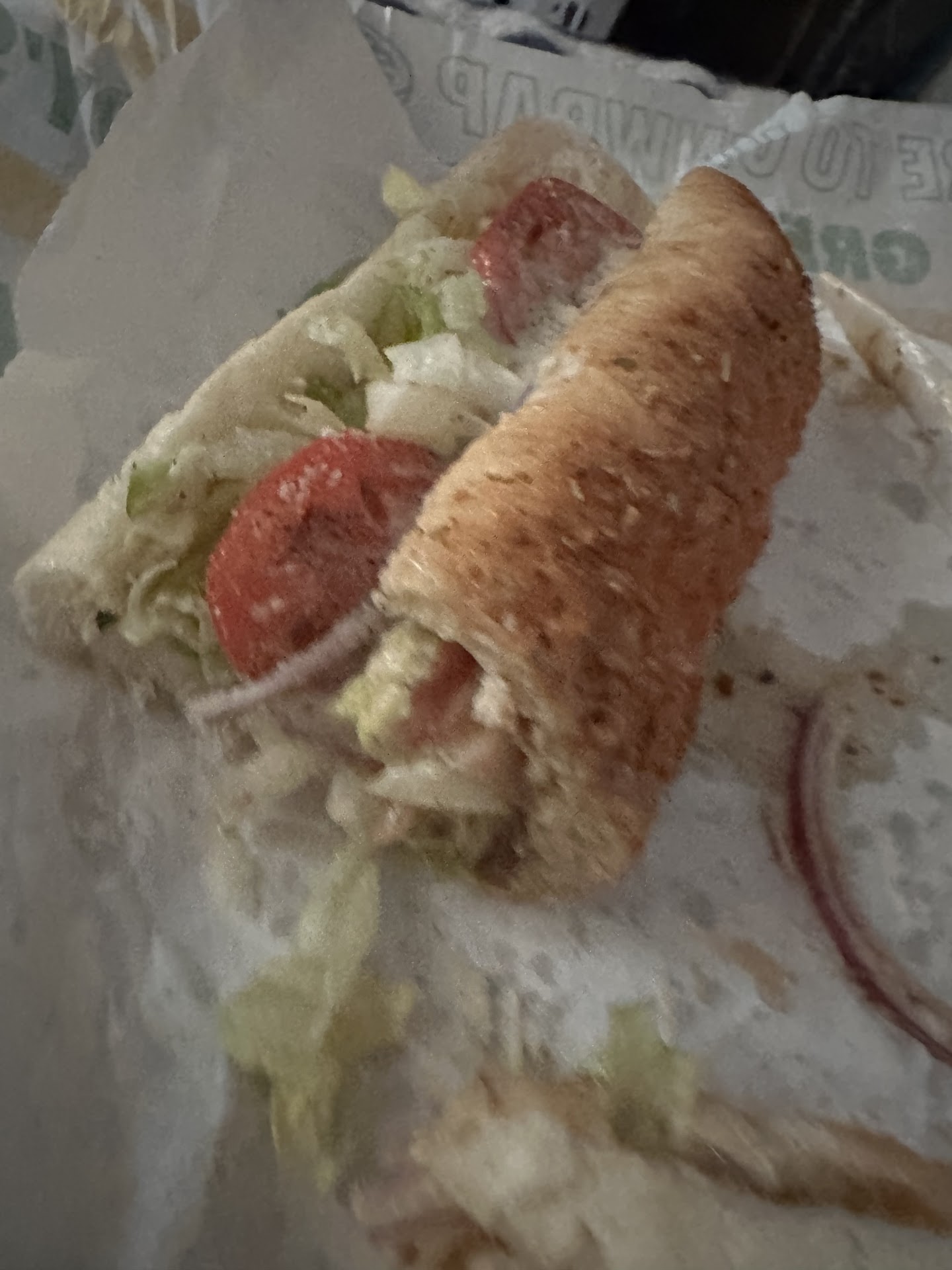 The pictures show my Foot Long Oven Roasted Turkey with extra onions and olives. I received only one end cut slice of tomato...