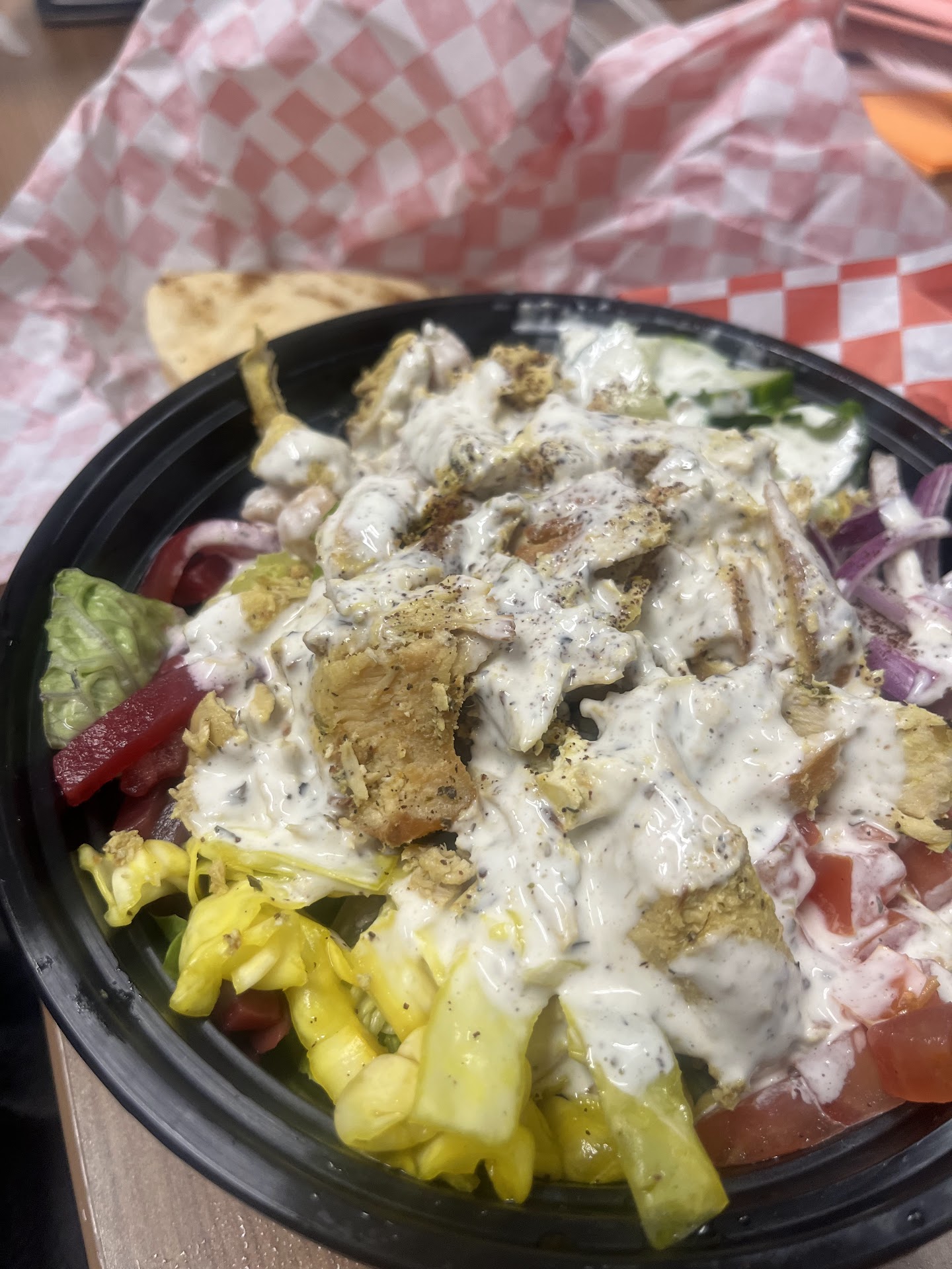 We went here for lunch since walking distance. They advertise to be Mediterranean food but it is far from. The guy at the counter was the rudest person I have ever dealt with we had 10 people with us ordering lunch and he treated everyone like trash. I would never allow this to be the face or my business. As we waited for our food we all agreed that if you can have someone so unpleasant and unprofessional working the front then the food must be amazing as why would anyone come back. We were all greatly disappointed. The food was awful. The meat was over cooked and dry. The Greek salad came with ceaser dressing. We will never be back. This is sad seeing as we just moved our office downtown. I have not heard one person say they enjoyed this place. Highly recommend you order tacos or pizza that are 5...