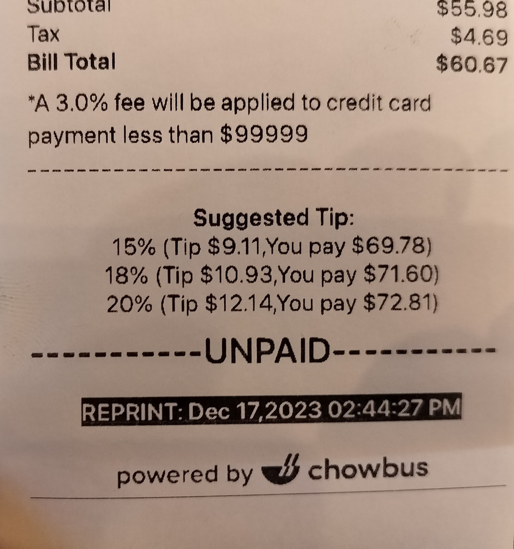 I've eaten here before about twice. On the 3rd visit, I brought my mom for dinner at this restaurant. The person had seated us and never gave the menu and no one came to ask to start off with a drink(s). Later, a couple came in and was also seated. We waited very long for a server to get our orders, but the people that they have seated had menus. After a longer wait of our food, these had finished eating and paid their bill. Man, I was furious! I kept my composure with my anger...later, I asked for a to-go box and the lady asked "how many?" I looked at her and she obviously saw our table of left overs were worth 1 plate. So one box. She doesn't make that executive decision of how many? I have to be the one to tell her? No one came to our table to give us the bill. We had to get up and pay in the counter, while the guy was looking at me that there was no tip added in the receipt and table. Lastly, the food back then was super good until that night we ate there. Like my late father used to say, it's not the food of how it's prepared or restaurant. It's the cooks who make em. I'm never dining here anymore. I felt embarrassed taking my mom there after I was boasting of how good the restaurant was. They proved us wrongly of our...