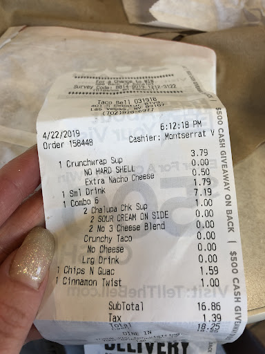 Read moreThe old Hispanic man who works the drive-thru around 4:40AM on Monday was just rude. He seemed irritated if you asked him for anything. I asked him for some more hot sauce and a cup of water, he begrudgingly got it for me, though he tried to hide that he was annoyed. Then he forgot to give me my receipt so I had to go through the drive-thru again to ask for my receipt. When I got to the window of the drive-thru he took a lot of time to acknowledge that I was waiting at the window then I told him that I needed my receipt, he told me - with a tone that suggested he was annoyed - that the system was down so he couldnât print receipts at that moment. The system being down seemed odd to me because how could a person take an order but not print the receipt of that order? But, letâs give him the benefit of the doubt, maybe what he said was true. Well had he just informed me of this before I left the drive-thru window or better yet before I made an order then it wouldnât be as bad and or annoying to me. But one thing is for sure I now know not to go to a Taco Bell, especially late nights or early mornings. Their are plenty of other companies that serve food,...