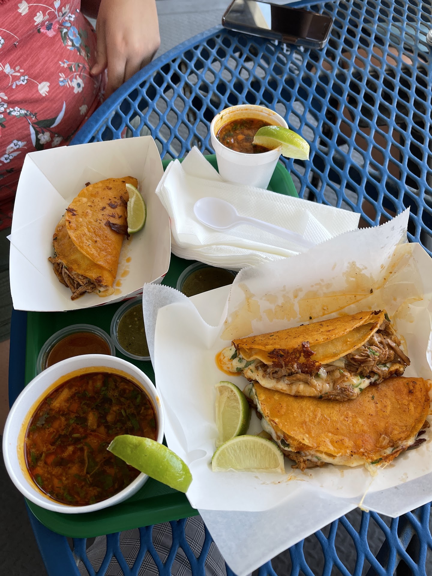 The decor is cool, but plan on enjoying your meal in the cozy patio area. Now, let’s talk about the food—the birria tacos are outstanding. Having sampled birria at many different spots, I can confidently say that these are top-tier. The salsa packs a punch too, complementing the tacos perfectly. This place is a hidden gem worth discovering, whether you're grabbing one, two, or three tacos. Don’t miss...