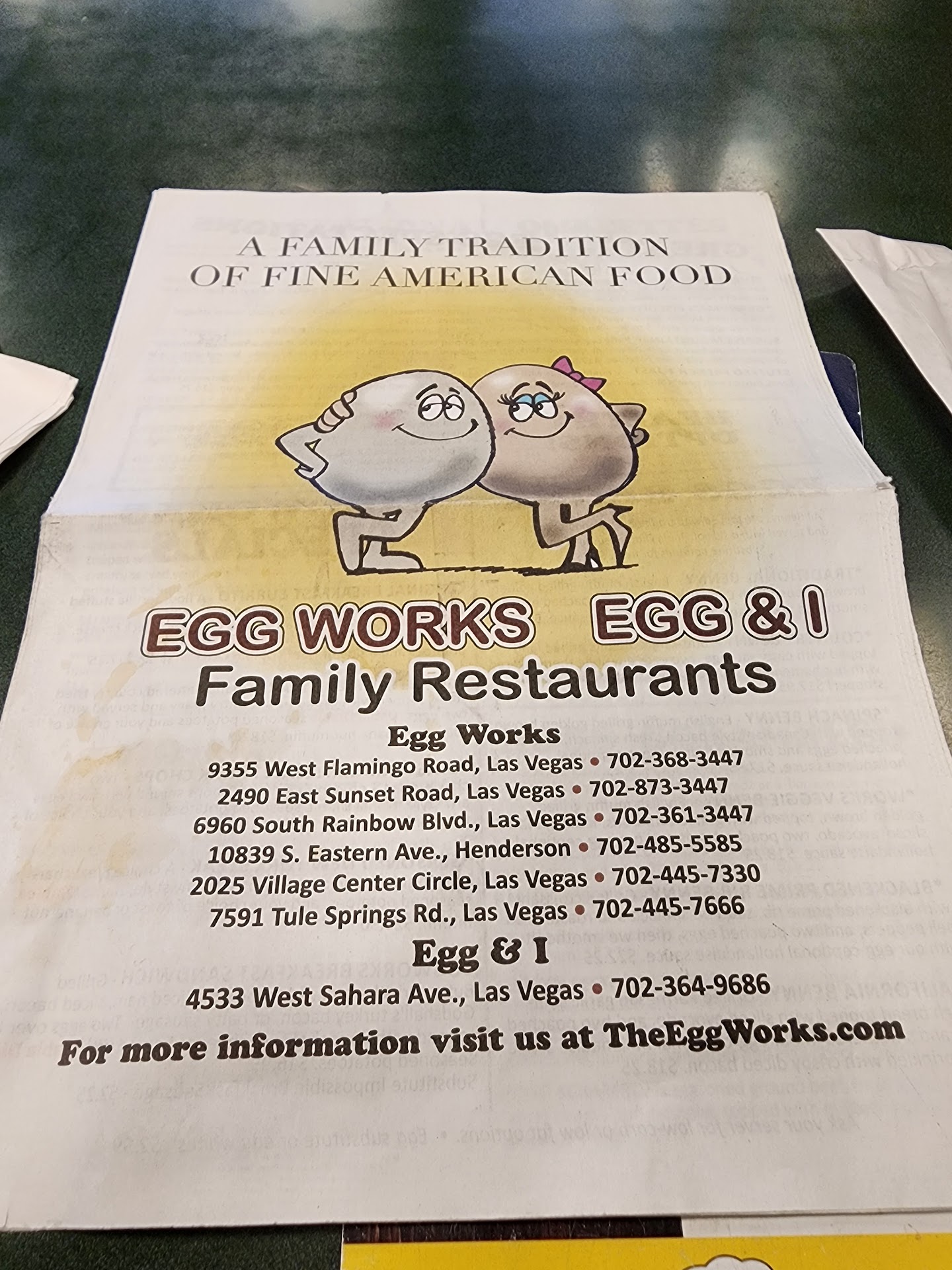 Read moreI've been coming to egg and I for many years. In fact my wife and I have been to probably every location in Las Vegas. Also known as egg works. Over the last year they have not only increased their prices, they are now actually very unprofessional business-wise. Why do I say that? In this world of unfortunately things go up cost of living goes up, wages go up. Trust me as a business owner I understand these cost are part of the business.. These things that go up do you have to deal with unfortunately, so does the cost of running the whole building, the water, the power, the gas. We can go on and on. The point is, the unprofessional act is that egg and I/ egg works, now charge you an additional fee to use your credit card.. in the menu as a penalty. So unprofessional and so wrong to put that. And they haven't done that ever. The only places I know that do that are usually small mom-and-pop or and a few Mexican restaurants. The prices are ridiculous to begin with, and then they charge you more to use your credit card. Really? I understand there's cost to use your credit card, but don't penalize the customer. That's part of doing business, hello? Eventually they'll put a surcharge when the power bill goes up... credit cards cost the businesses money...I know So when the power bill goes up next month are they going to charge a surcharge to use that too, well you know you have to have the light on when we walk in.. to me this price gouging is very unprofessional. Look things go up unfortunately, but don't penalize the customer for using something that's been used for years for convenience. I don't even go to gas stations that charge more for credit card. That's very unprofessional and I will not be going back to egg and I or any of the locations , which is egg works. Is it only about cost? Well of course not but the service wasn't too good today either. Just because their portions used to be really big, you can see the cutbacks due to the price of eggs going up through the years. But charging more to use your credit card on top of the high prices that just drew the line. Due to the bad customer service today. I do not recommend any longer because of the price gouging, and I will not be...
