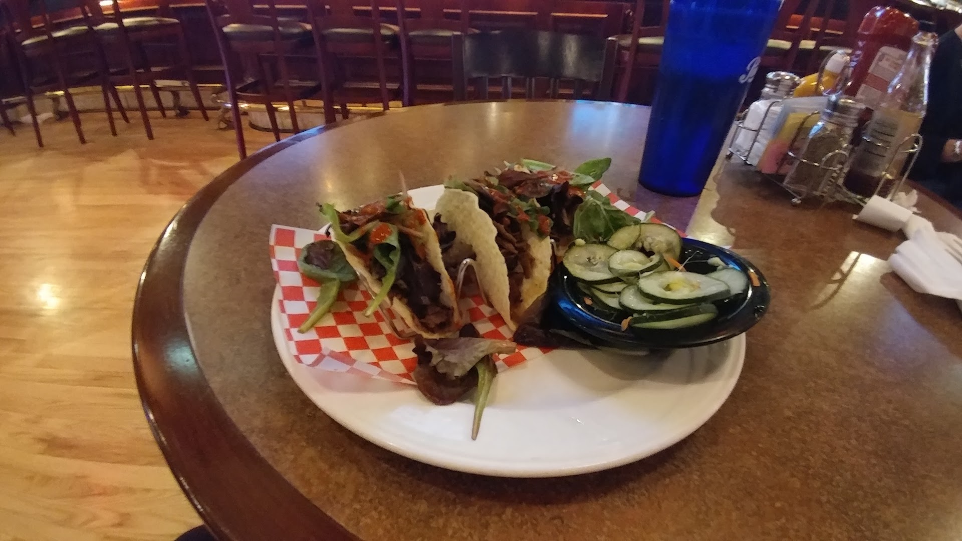 The tacos contained what I can only describe as chipped beef, or something similar to cheese steak meat, some spring salad mix, and some sriracha sauce on top. The plate came with a side of cucumber salad, which was OK, but not really Korean, not pickled much and reminded me more of a Thai cucumber salad.