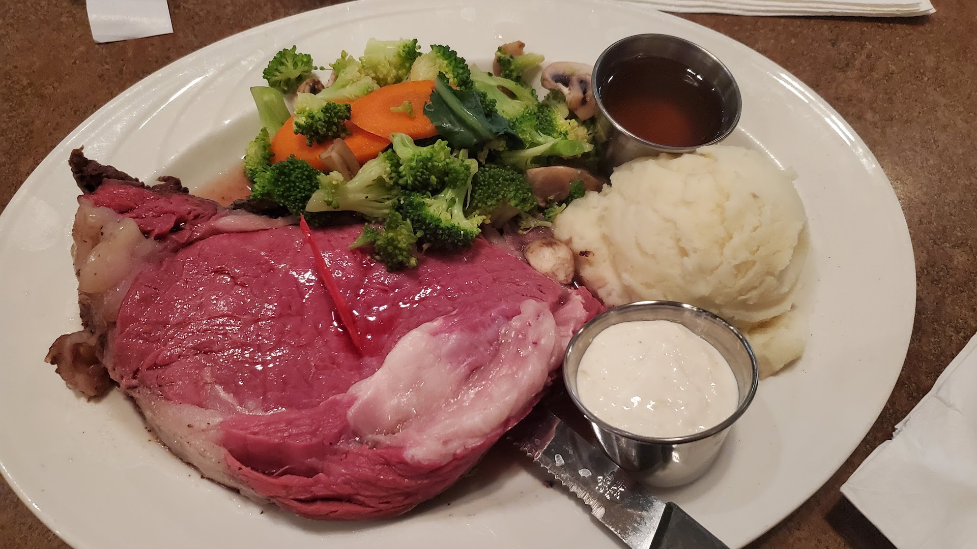 My husband and I ordered the prime ribs ($17.50) He ordered his medium rare and I said "whatever is the rarest piece still available." The waitress said, "so rare?" I said, "yeah, sometimes places only have medium as their rarest piece later at night, so if that's the rarest piece still available, that's fine."