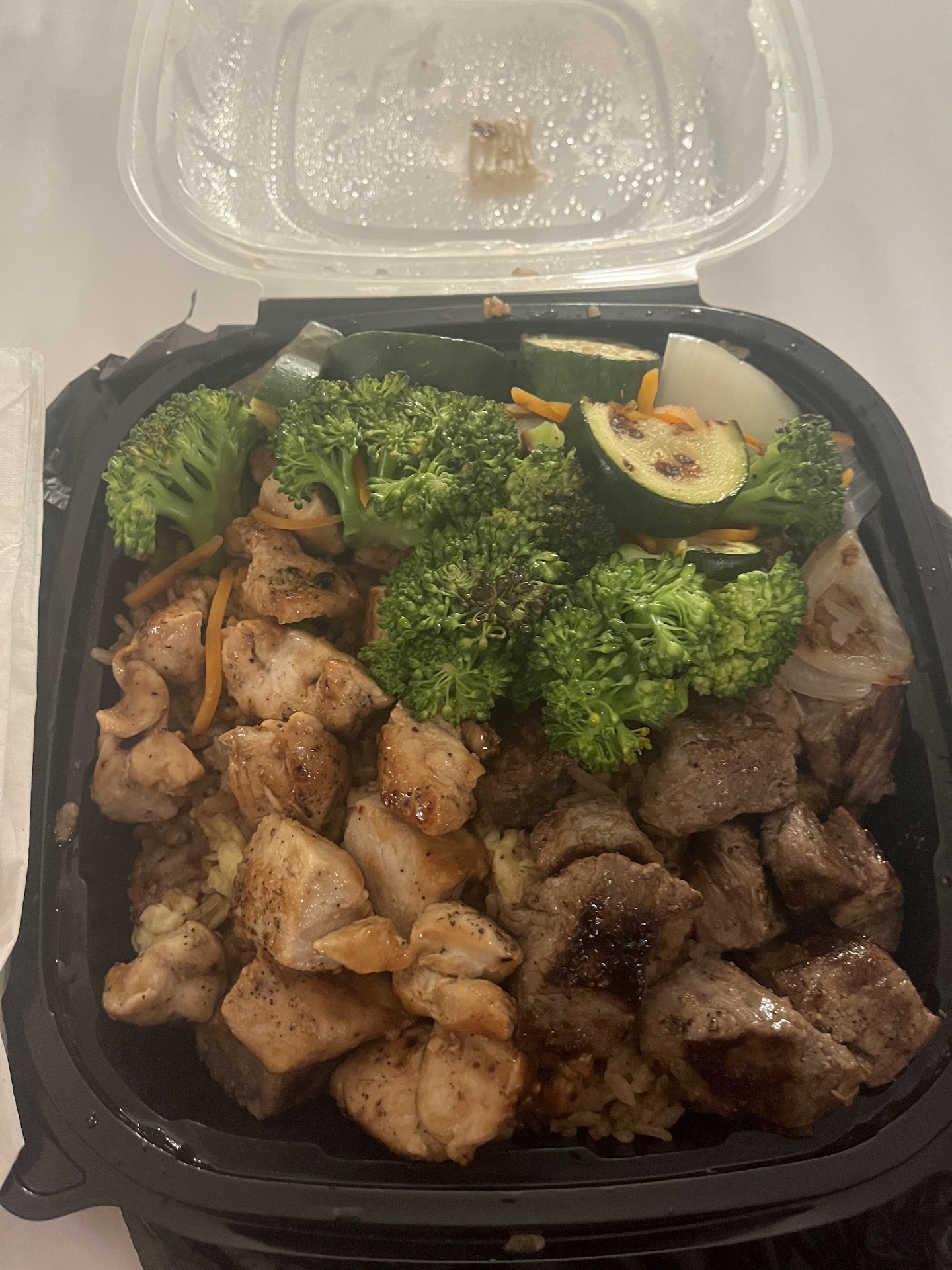 The steak is seared with precision like Zachās got Gordon Ramsay in his earpiece. The noodles and rice play together like theyāve been best friends since kindergarten. The pot stickers are golden little pockets of happiness. And the yum yum sauce? Iām convinced heās cracked some secret culinary code because nothing should taste this good without breaking international laws.