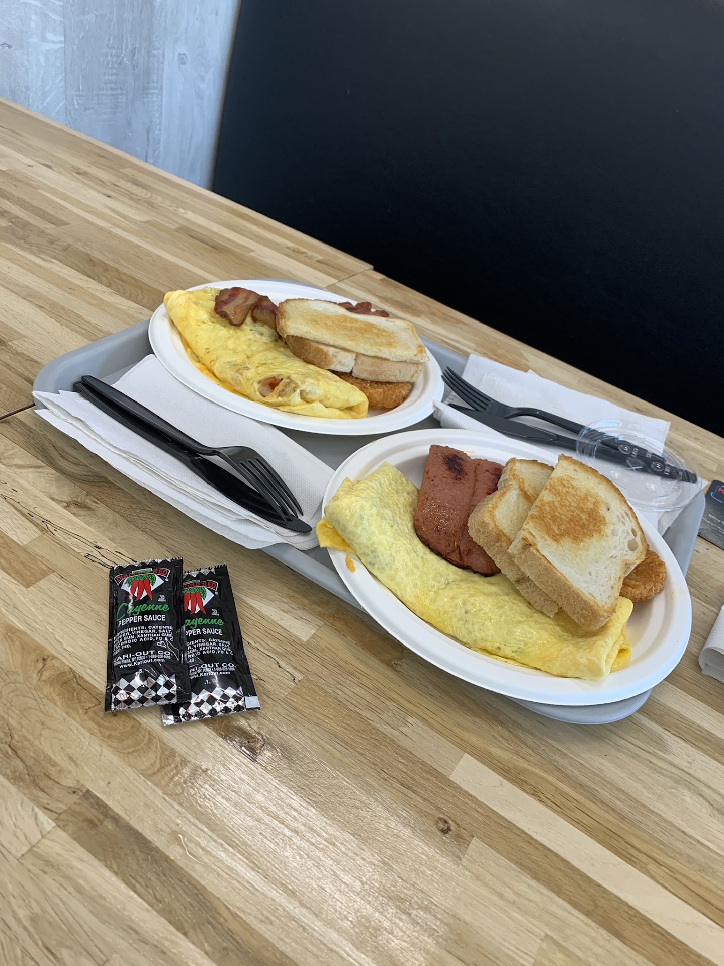 The omelets were top tier. The sourdough toast had just the right crunch. Bacon was fresh and had a nice chewiness. I had a hotlink with mine, but will try the pork sausage next time. Condiments were available and nicely sorted, so I grabbed a couple of hot pepper sauces.