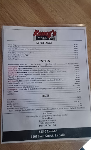 Read moreThis is is must go check it out!!! Koncz's Bar is a local LaSalle bar the owner " Koncz" is shown in the picture below owns and runs this establishment. He makes you feel at home. Great drinks and Amazing food!! His home-cooked fried chicken will have your mouth watering. It is Delicious!!! It's a Great find if you've never been there and you'll definitely...