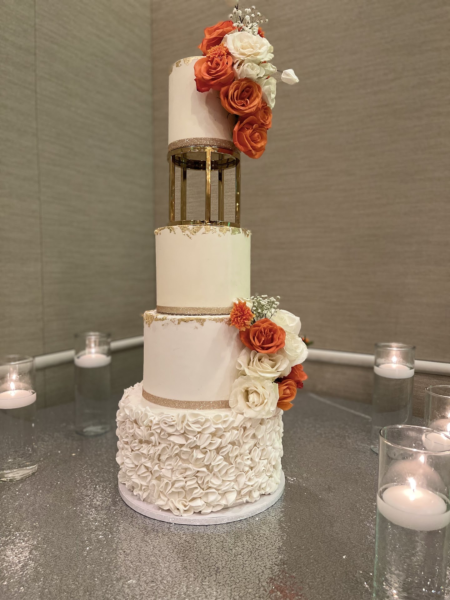 ural and munisa did such a great job with our wedding cake! our wedding was fall-themed or terracotta colored. i asked her for something very, very simple with orange and white flowers. we also let her know weād be keeping the top layer for our one year anniversary (AND THEY SEPARATED IT š). munisa has such a good eye for cake design and will walk you through the design/how to bring your vision to life. she suggested doing a dummy layer at the bottom to make it look tall & also helped us figure out how big we wanted the circumference of each layer to be.