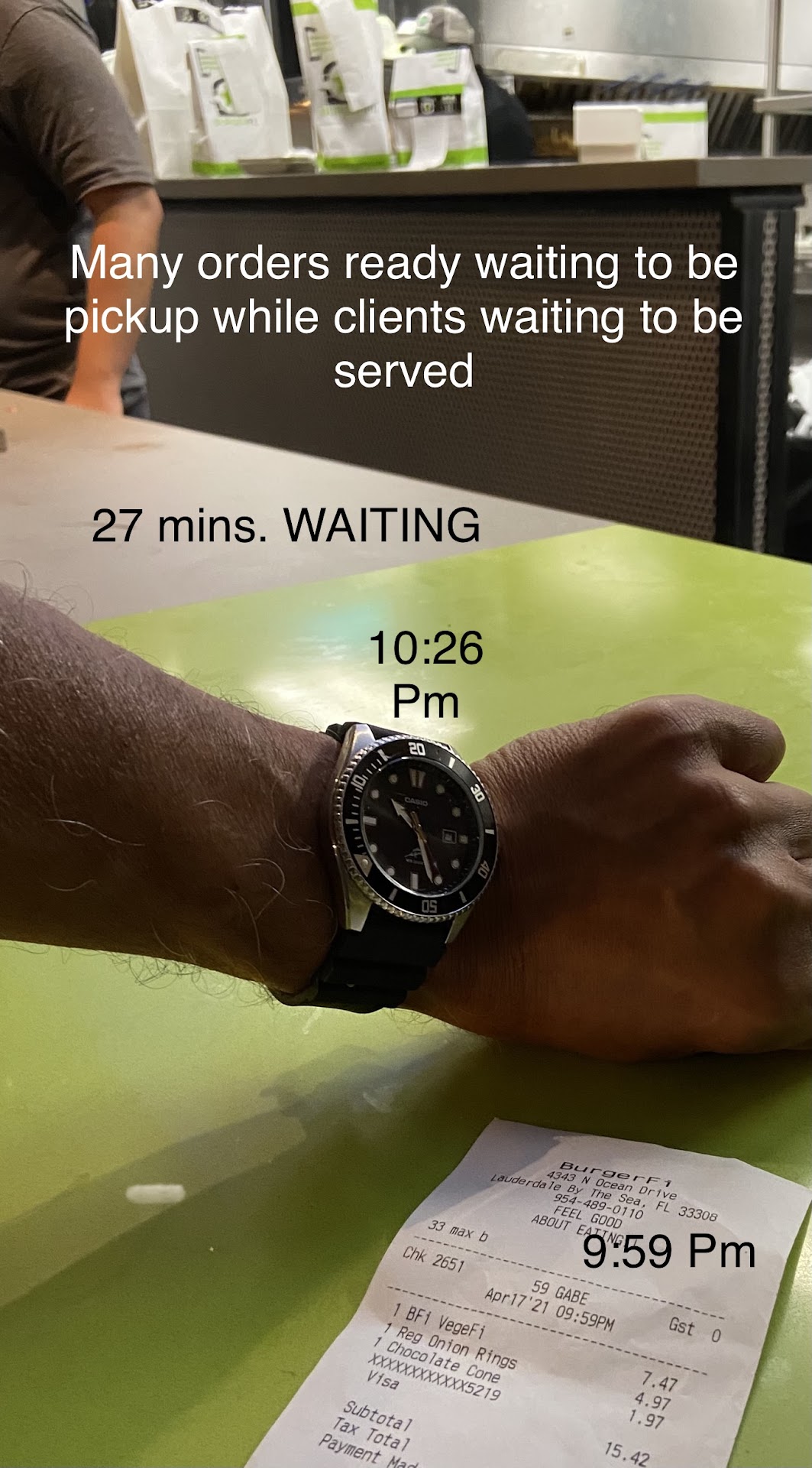 The food was fine, but it's hard to mess up burgers. The team travels a lot, & we've never had these problems at other Burger Fi locations... Or Shake Shack, Chick-Fil-A,...