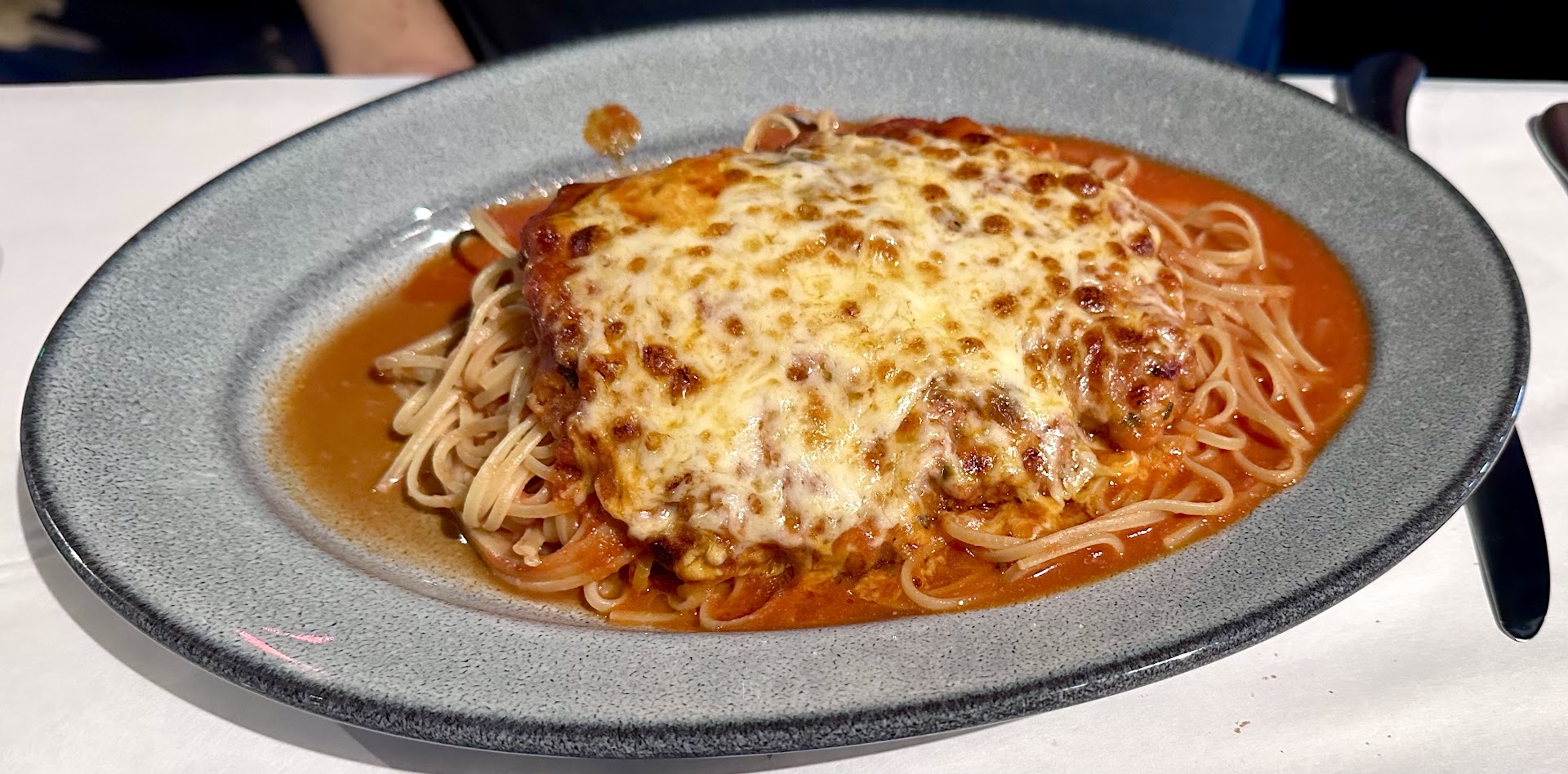 Next up: Chicken Parmigiana! We were both really hungry so we each ordered our own (we mostly share an entree). WoW!! Delicioso! Tender chicken breast, beautifully breaded, topped with parmigiana cheese and of course, de rigeur red sauce on a bed of linguine. 5 Yums đđđđđ for this one!!! The Original Comfort Food for me. My Pinot Grigio lasted the whole meal.