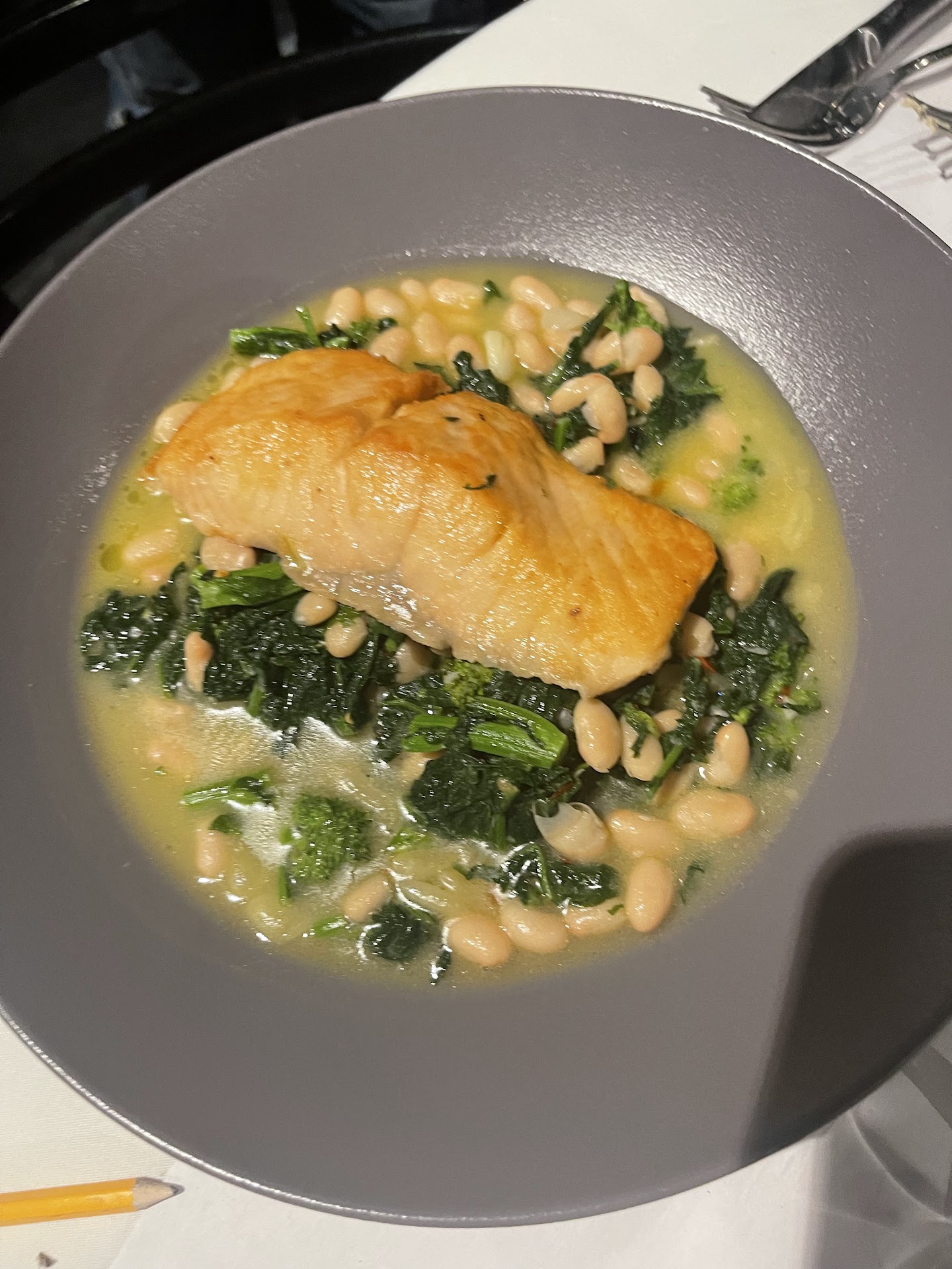 Our waiter, Pinto, was on-point all night. He came to our table right away too and took our drink order. Iced tea for he, a sumptuous pour of Pinot Grigio for me. We ordered: