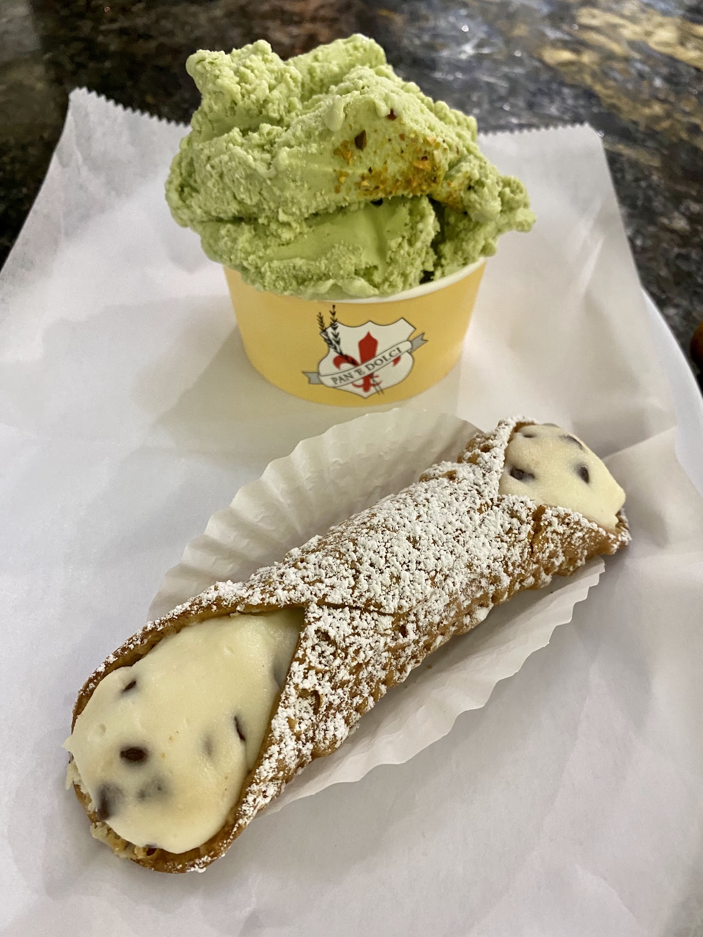 The toasted panini was so delicious with the salty prosciutto, creamy melty cheese, and meaty tomato served on a crusty bread. The cappuccino was also artfully made with a thick foam topping. The only thing I didn't care for was the cannoli with its soft shell. I think I will stick with my favorite place that pipes it fresh in front of you. The cases were filled with other treats like the fruit topped pastries that I would try next time. Also on my list for next time was the beautifully presented gelatos adorned with fresh fruit, nuts, and cookies.