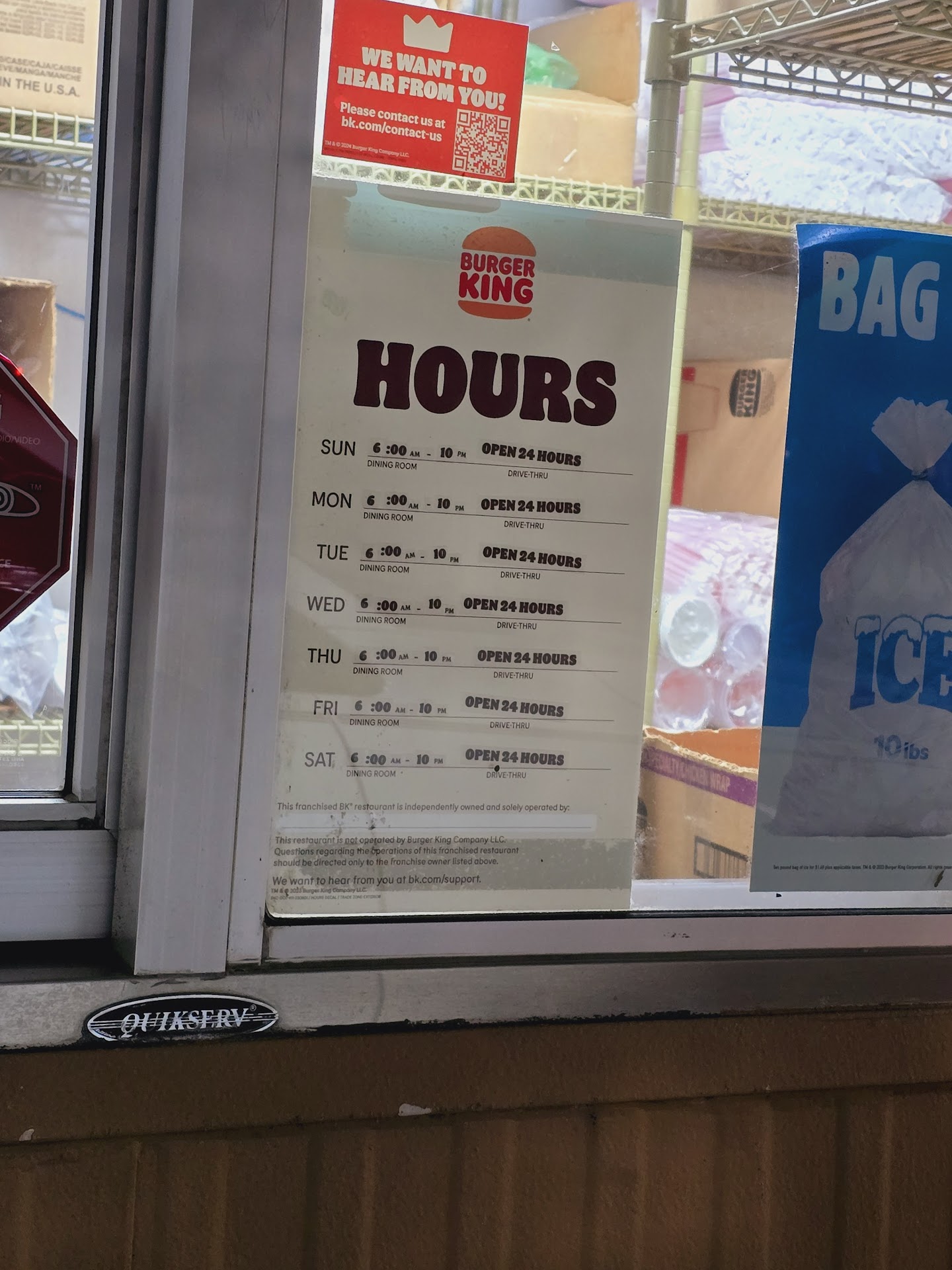 Read moreThe lady working the register and taking orders, she was great. When receiving the order, different story. Some of the onion rings were burnt and old. When I say they were hard as rocks, I mean granite! I was supposed to have 3 cheeseburgers, I get home and there are none, not 1 damn cheeseburger in the bags. I had a large order and it required 2 bags. I was pissed. I called the restaurant and guess what? Got a recording saying the subscriber can't take calls, so I'm really pissed now. I have 2 BK restaurants in my neighborhood that I could have went to, but I decided to give them a try since I was in the area and had never been there. Well I've learned my lesson. Stick to what you know. I don't plan...