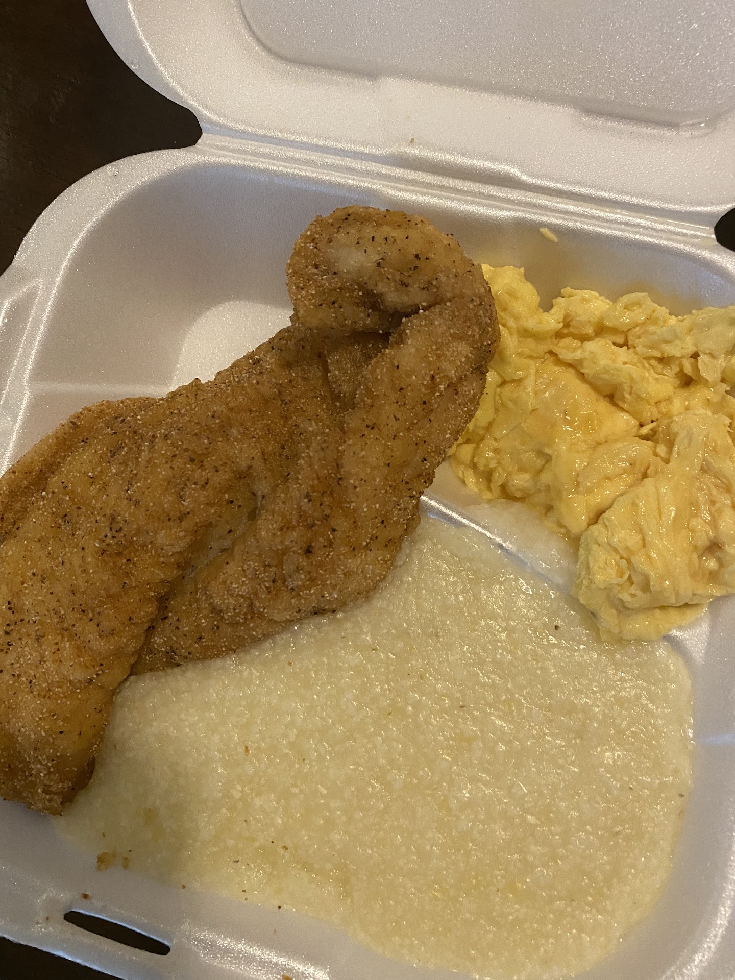 Food: I got the fried catfish breakfast. The fish was delicious. I asked for it to be fried hard and although it wasn't fried as hard as I would have liked, it was still good. The eggs were fine; I mean they're eggs. The grits, I was not a fan of. Every since I've had ikrave grits, I don't like grits made with water and these were just bland.