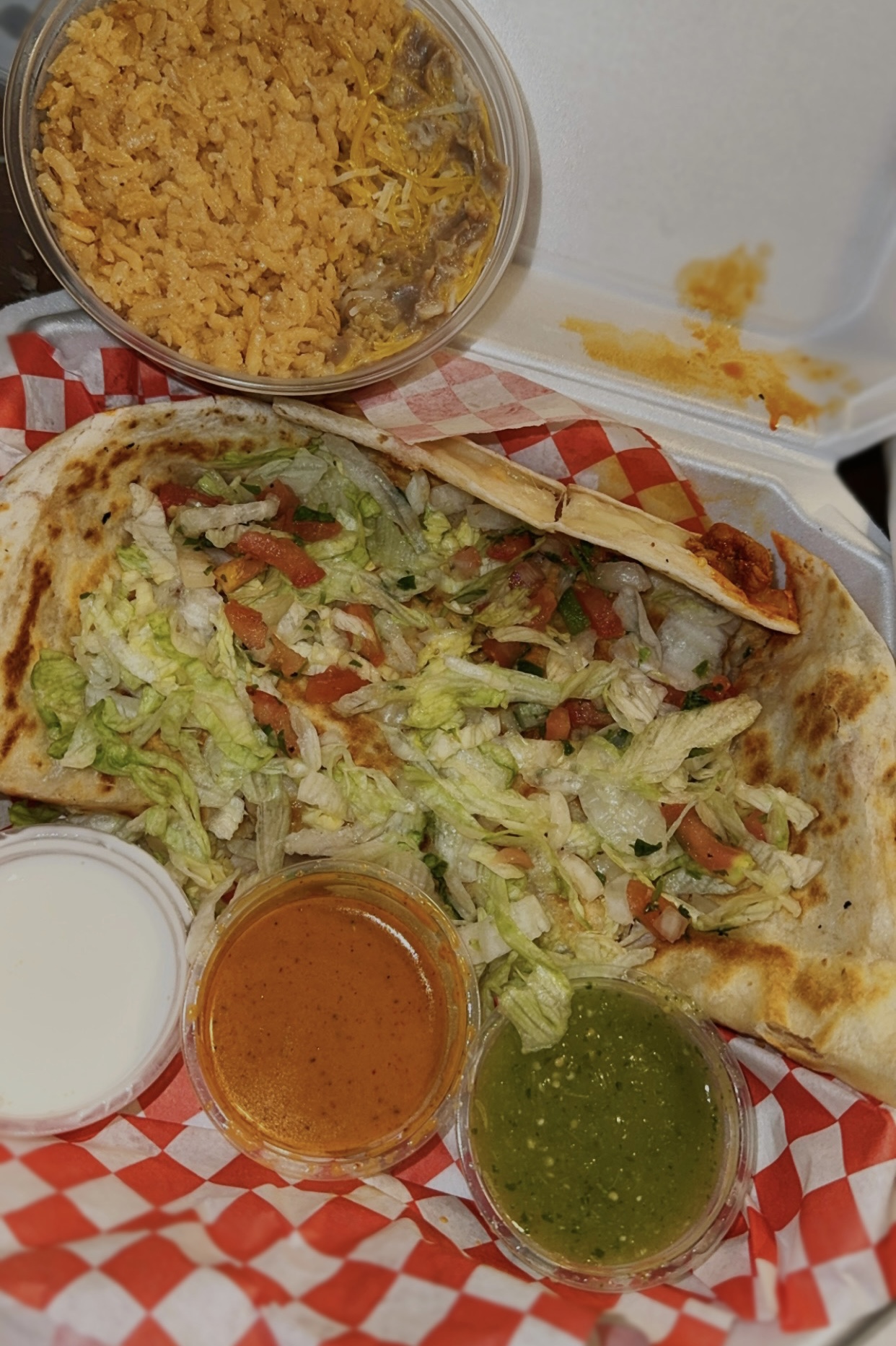 Read moreI got a chicken quesadilla, rice, & beans. I went 3mins before they closed & the woman was very kind & got my order ready quickly. Very friendly environment, the portions & prices are great, the green sauce is really good, I definitely recommend. accidentally flipped my togo box upside down so the pic is...