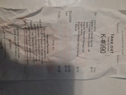 12/21/2020 Ok, and addendum to the previous review, I know I'm a little late on this current review but I must congratulate great service when I receive it! About a month ago 11/23 I went to this Popeyes to pick up dinner after a long day at work (I'm a Postal Carrier, so you can imagine how long). So I walked in and was immediately greeted and I truly felt welcomed. The service was so good I wrote down both employees names, Daekwon and Travoris. They were both attentive to the detail of my order and also offered me something to drink as complimentary. Honestly it was the little things that impressed me. As a franchise the food can usually be about the same wherever the location, so what usually makes you stand out is the service and that night I receive exceptional service. Sorry I'm a little late on this post, I hope those two young men are still working there. Also, I am changing my 3...