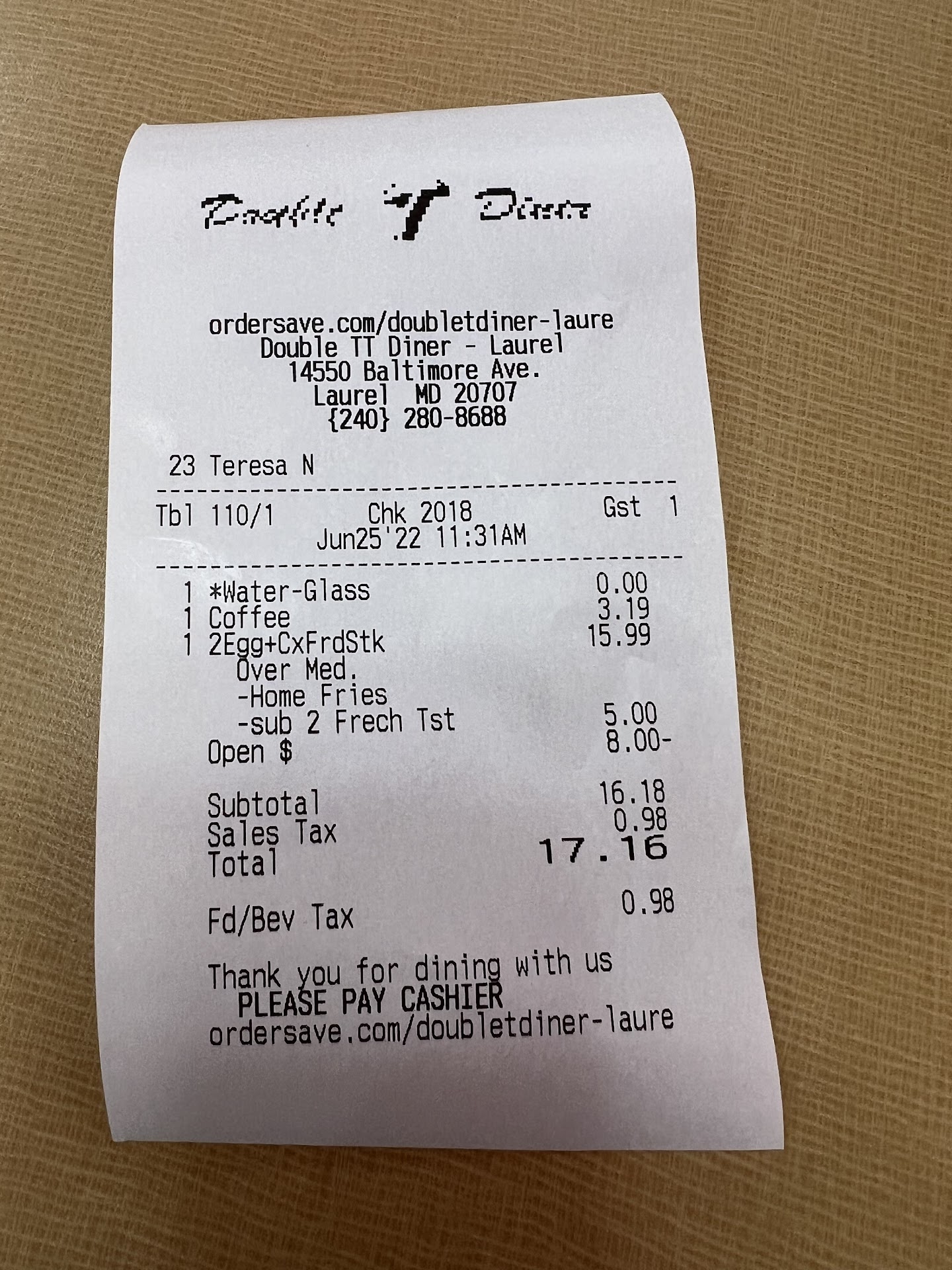 After reading a lot of the negative reviews of this place, I’ve been avoiding it like the plague. So when the time came that I actually found myself at the Double T diner for breakfast, I have to admit I was downright scared. But I was also very hungry. I was skipping my go-to choice, First Watch, because there was a crowd waiting there, and I hate waiting in line, especially for breakfast. First Watch Laurel has become, in my opinion, a victim of its own success. In the words of the late Yogi Berra, nobody goes there anymore — It’s too crowded. So that’s how I found myself at a table at the double T diner: hungry, and nervous.