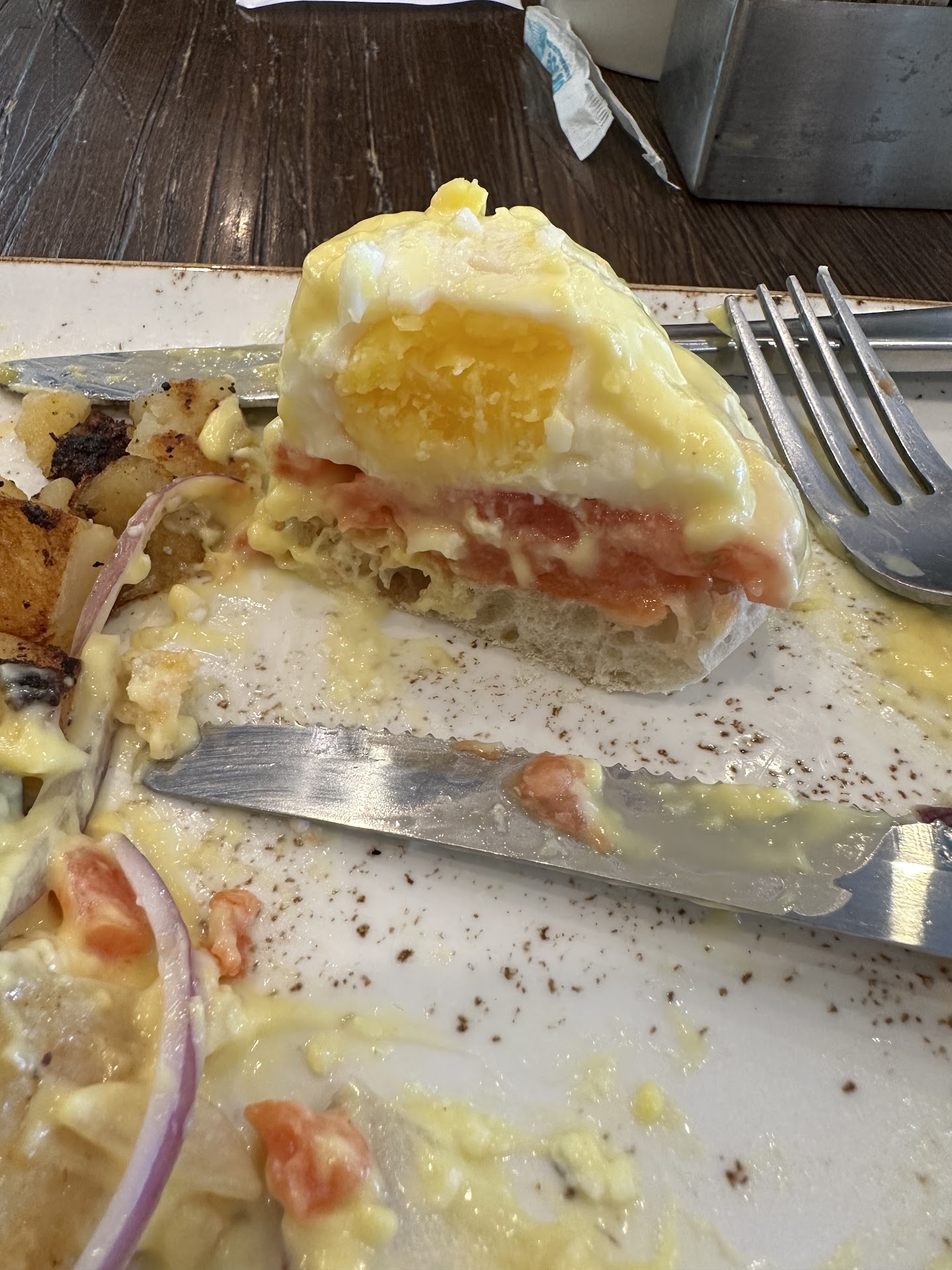 Read moreHORRIBLE!!! I had never been here before and my mother, grandmother and I wanted to try something different. When we arrived it was very busy which is always a good sign. I wasn't thrown off at all about the hour wait and we all stood near the waiting area since it was chilly outside. Almost 70 minutes later we are still waiting on a table with countless others who came before us so my grandmother and I get up to see what is happening. The cashier proceeds to tells us there are 9 people ahead of us and we would be waiting for an hour and 15 minutes on top of the time we've already been waiting. The hostess who originally took my name down reappears and lies and says she told me that the wait was over an hour and that reservations are priorities and walk ins can be waiting anywhere from an hour all the way until close to be seated! She also told my grandmother if there are 20 reservations they will all still be seated before people who are just sitting and waiting regardless if they're on time or not! Once she sees we are displeased they magically have a table for us and seats us before people who were there almost a WHOLE HOUR before us. I ordered the market hash (which is vegetarian) and a blueberry pancake. My food was lukewarm so you knew it had been sitting and the hash had bacon and onions in it which is not said in the menu description of the dish so they're just throwing whatever into my food. The egg on top of the hash was also rubbery. We tell our waiter the issue and he comes back out and again we are lied to as he tells us it's potato skin, not bacon. I work in a professional kitchen and have for 10 years. I know the difference between potato skin and chopped bacon! NEVER eat here. You're better off waiting at Milk N Honey. At least the food is hot and correct when it gets to your table. Hell even IHOP would be better...