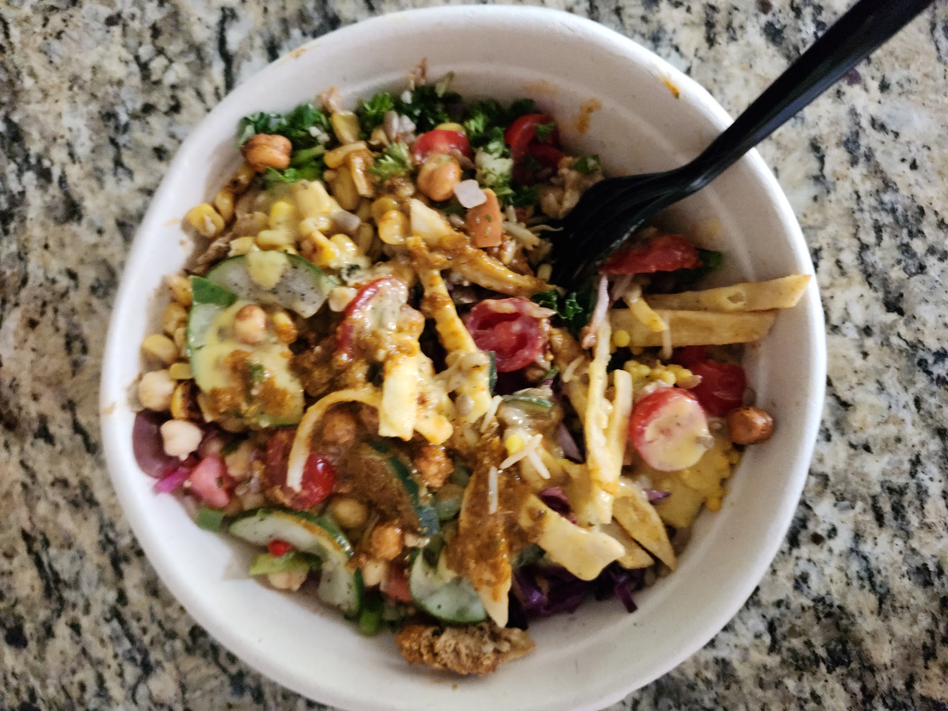 I ordered the Chicken Shwarma bowl with kale and white basmati rice. For the toppings in chose the baba ganoush, crazy feta, cabbage, roasted eggplant, olives and the yogurt dip. For the sauce I went with the recommended Harissa sauce which is not too spicy but does have a kick. The serving size is pretty large which is great for the price of a bowl. You can upgrade to steak or lamb for extra money as well but I chose to stick with chicken. Everything was fresh and delicious. I highly recommend the roasted eggplant, pure goodness! It may seem small but I love the fact that if you are eating there they give you a real bowl and silverware as well a huge glass for water, which was awesome!