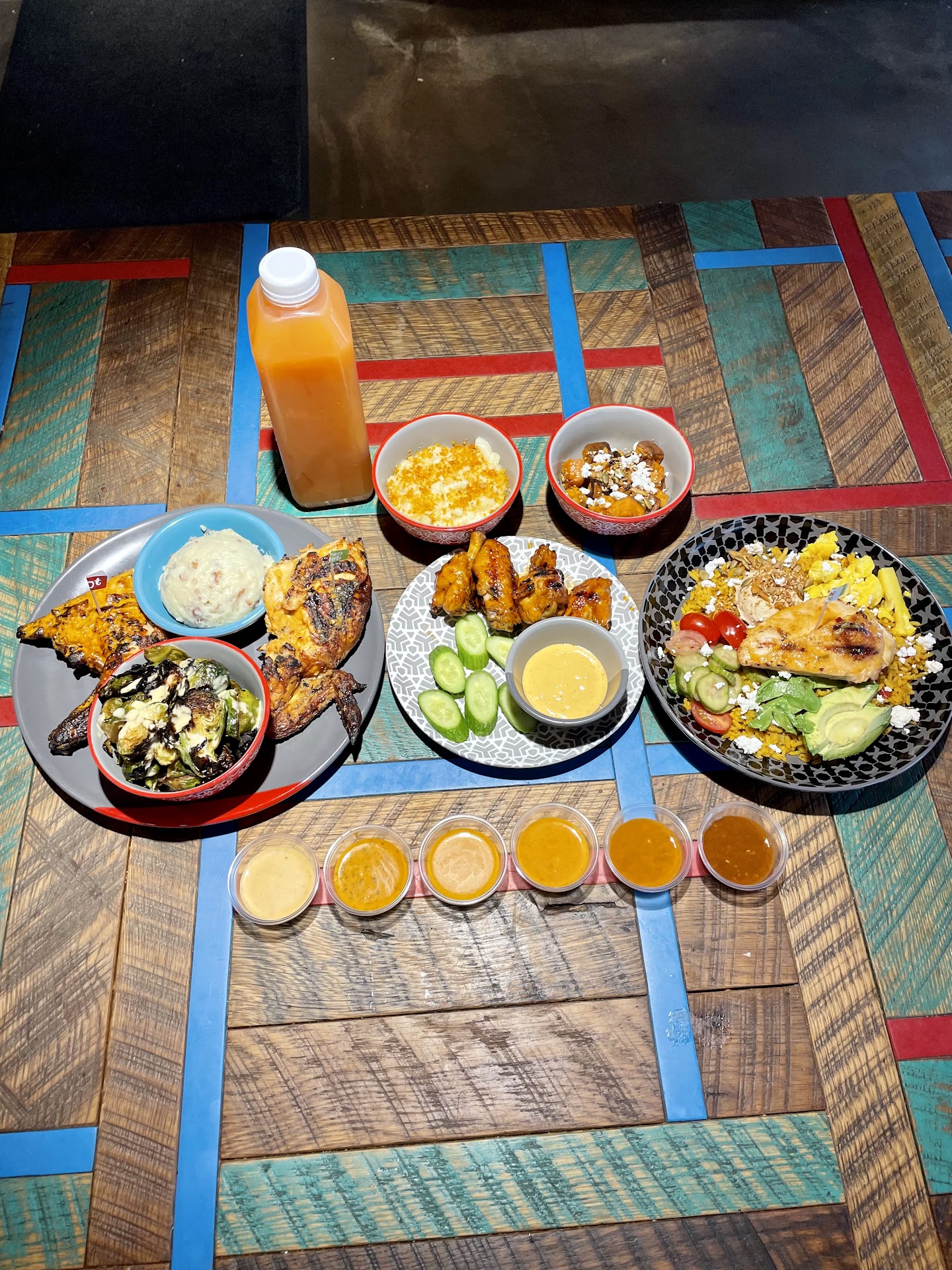 Their Peri Chicken Rainbow Bowl (with Avocado, tomato cucumber onion salad, pickled cauliflower, hummus, superseed crunch, and feta served over Portuguese rice and finished with a Lemon & Herb PERi-PERi drizzle $14.99).