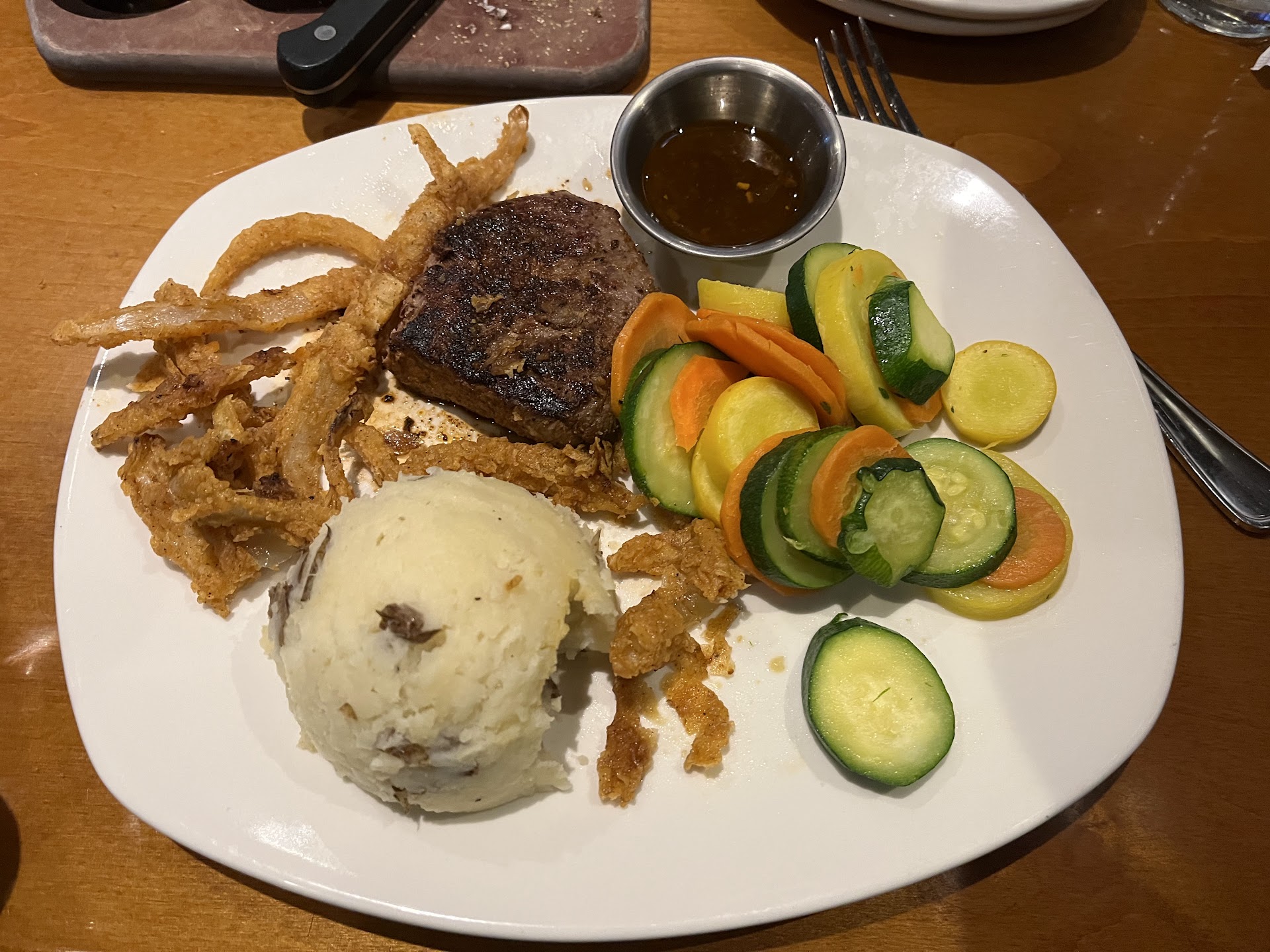 Additionally, I asked for mashed potatoes. Technically, I guess, it was mashed--into a contained that gave it the dome shape. NO DAIRY OF ANY KIND was involved in making it. The sirloin was a bit tough, and everything tasted like it had no-to-little seasoning. My sister-friend ordered the same dish. She did not even finish it. I barely ate mine and got it boxed figuring I would 'fix it' at home. Not sure if I will even bother. Lastly, our waiter was very average. Think her name was Toni. She did not: come by much, ask us how our meal was, and/or whether we wanted anything else (i.e. dessert etc.). Forgot to bring things we requested. My friend ordered a drink that never came. Only positive in this whole experience--and reason for the rating--the bread was good.
