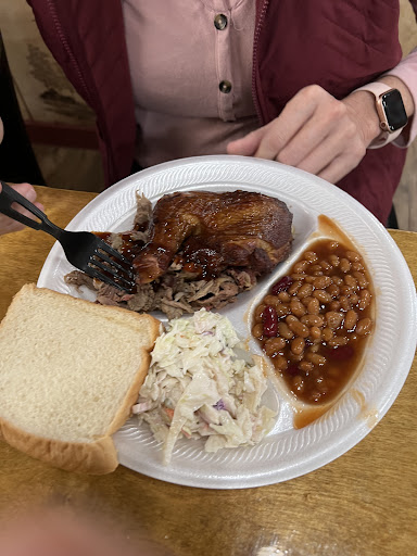 Read moreI ordered a pulled plate pork and my husband ordered the ribs on our recent visit here. We had potato salad, green beans, potato casserole and cowboy beans as our sides, which were all tasty. The ribs were good, a bit on the dry side, but they were still flavorful. However, the pulled pork was so greasy that I couldn't even eat it all, plus I've never been served greasy pulled pork in my life. Not only was it greasy but it was also dry, tasted a bit overcooked. The bbq sauce was mediocre and there was only one flavor to choose from that wasn't A-1 or something store bought. I'm giving it 3 stars because of the greasy pork and the atmosphere was interesting but it could have used some background music for a bit more ambiance. Also, there was no baby changing station in the restrooms. All of which can be...