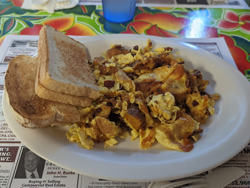 Upon menu perusal, I immediately imprinted on Meg's Scramble, which was basically a pile of eggs, cheese, home fries and bacon. It was like a breakfast sandwich threw up on my plate in the best way possible. You can see from the attached that it was a giant portion, not even including the four pieces of pre-buttered toast. In hindsight I'm not sure how I polished this off and still managed to eat anything else the rest of the day, but perhaps that's the power and beauty of vacations. Very scrumptious though - if you're in the mood for a hearty, savory, dish, it's hard to go wrong with something like this. And at $9, the price point was one of the best I saw down the shore, though honestly a lot of them were pretty decent. Everyone else was pleased with their meals as well. In true diner fashion, Meg's had paper placemats with a collection of local business advertisements, which prompted a fun "I spy" game focused on the tinier objects in the pictures (try to find the dinosaur). We didn't have to wait particularly long for our meals, but that certainly helped pass the time a bit.
