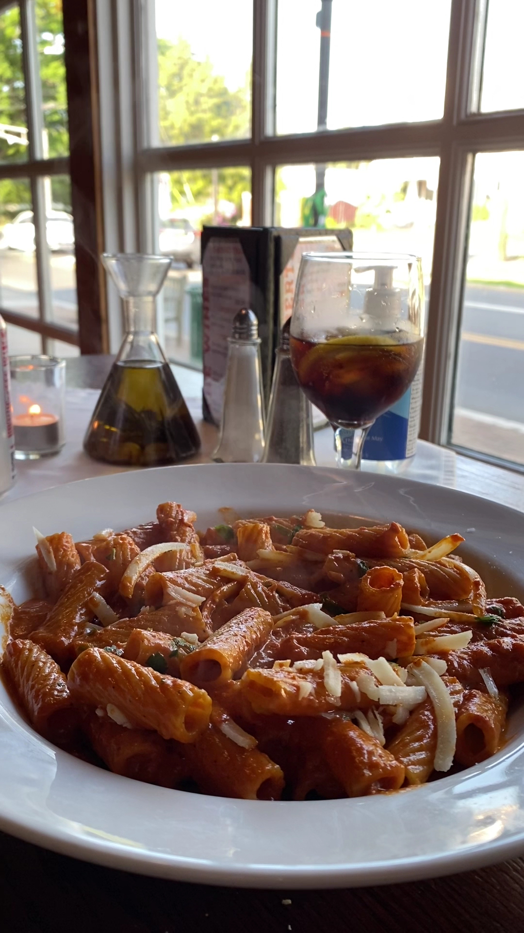 A finely prepared dish speaks to the mouth much like a ventriloquist in which an, “Mmmmmm,” escapes as you swallow your words. There is nothing like perfectly cooked pasta and coarsely chopped fresh Parmesan to remind you of where you are. And the vodka sauce set itself apart from all others—thick and flavorful. It was more like a purée, traveling with the rigatoni to my mouth. Somewhere along the way, I remember learning that thick sauce helps prevent mishaps that can ruin a dining experience. I can fully appreciate this. My blouse thanks you.