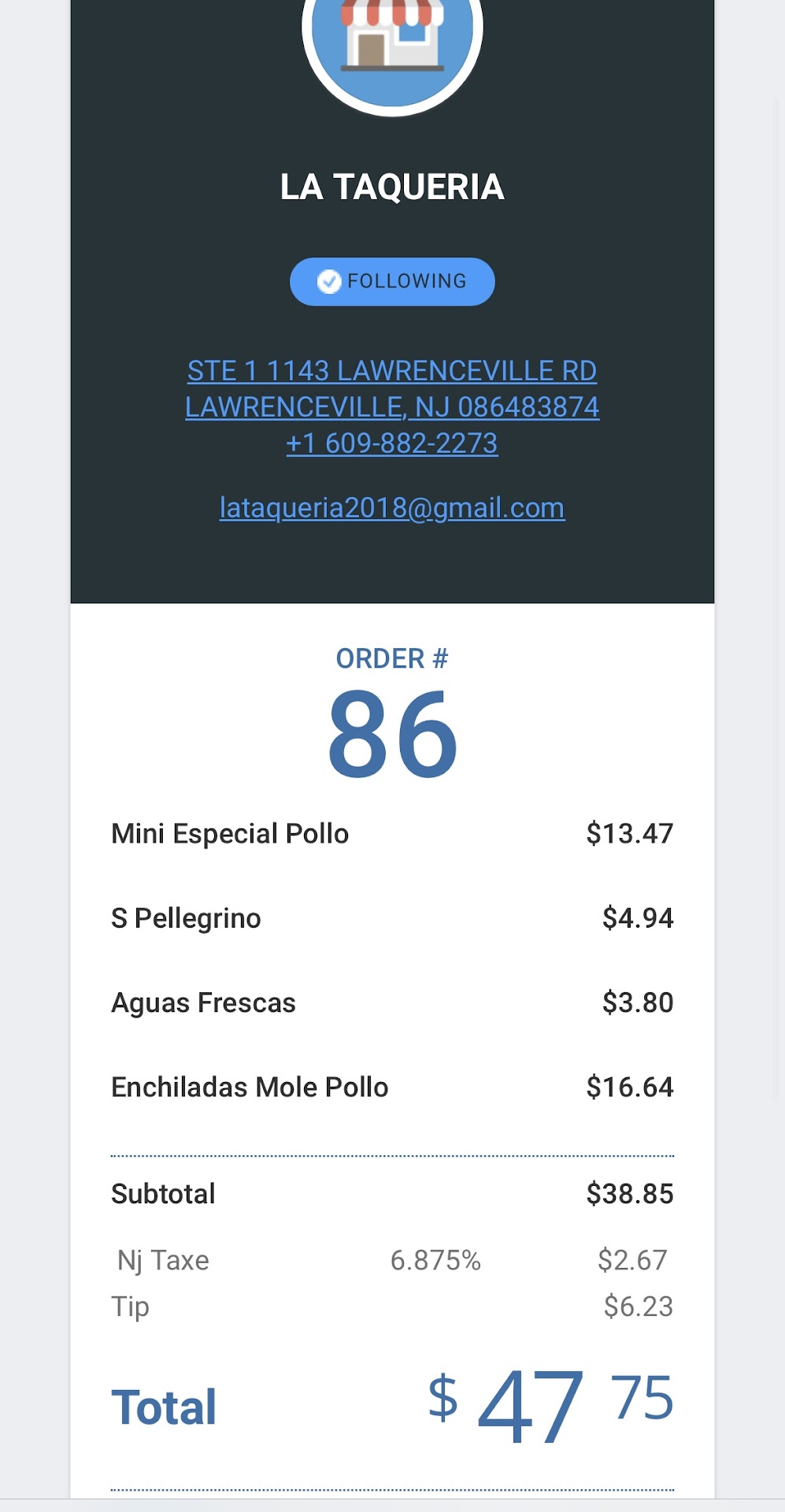 when I was trying to place my order at the counter, the lady didn’t seem to know her menu even though I made it clear I wanted “ enchiladas de mole”. Everything is overpriced as you can see on the receipt. I didn’t order the San Pellegrino but a sweet tea and pretty sure the sweet tea is cheaper than the San Pellegrino. Also a kid’s meal for 13$? My son’s chicken was dry and over cooked, my enchiladas de mole did not taste good at all, and was way too watery. It lacked flavor and seasoning. The mole sauce tasted like old/burned. After the lady dropped off our food, she never came back to see how we were doing and if we needed anything. Also their horchata isn’t good and barely tastes like horchata. The red rice was also not good, again, it lacked seasoning and tasted off. Both my son and I, were really disappointed, this is not real authentic mexican food and I went to tex-mex that were even closer to authentic mexican food. I will not be back, it was very expensive considering the quality and...