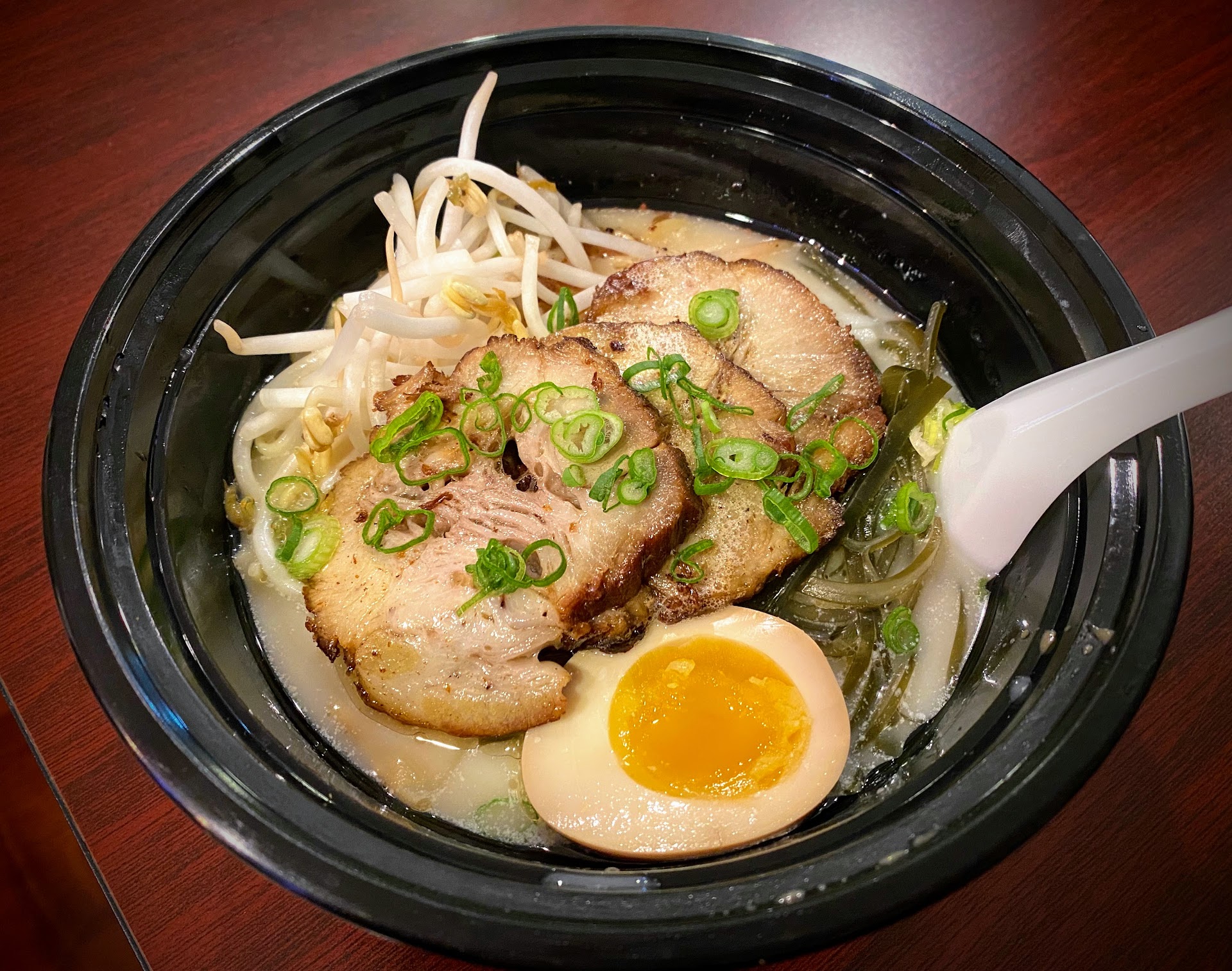 The portions were small for the money, and even though we ate inside, we ate out of to-go containers with cheap thin plastic spoons that fall right into the bowl, as mine did. The only upside was that there were lid's available and we didn't have to transfer my wife and son's leftovers into another container since they were in to-go containers from the start - just add the lid.
