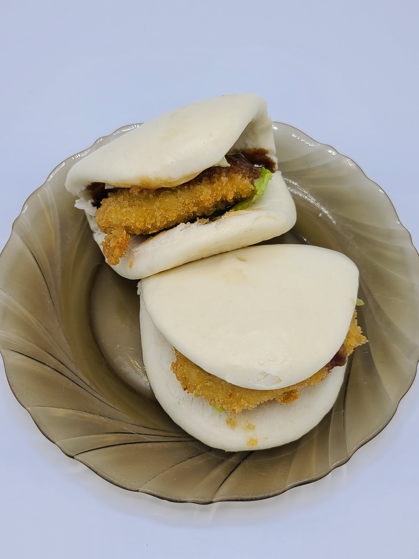 From our steamed buns (chicken katsu, cucumber, lettuce, scallion, signature glaze) cucumber, and scallions were missing in action, just a leaf of wilted lettuce.