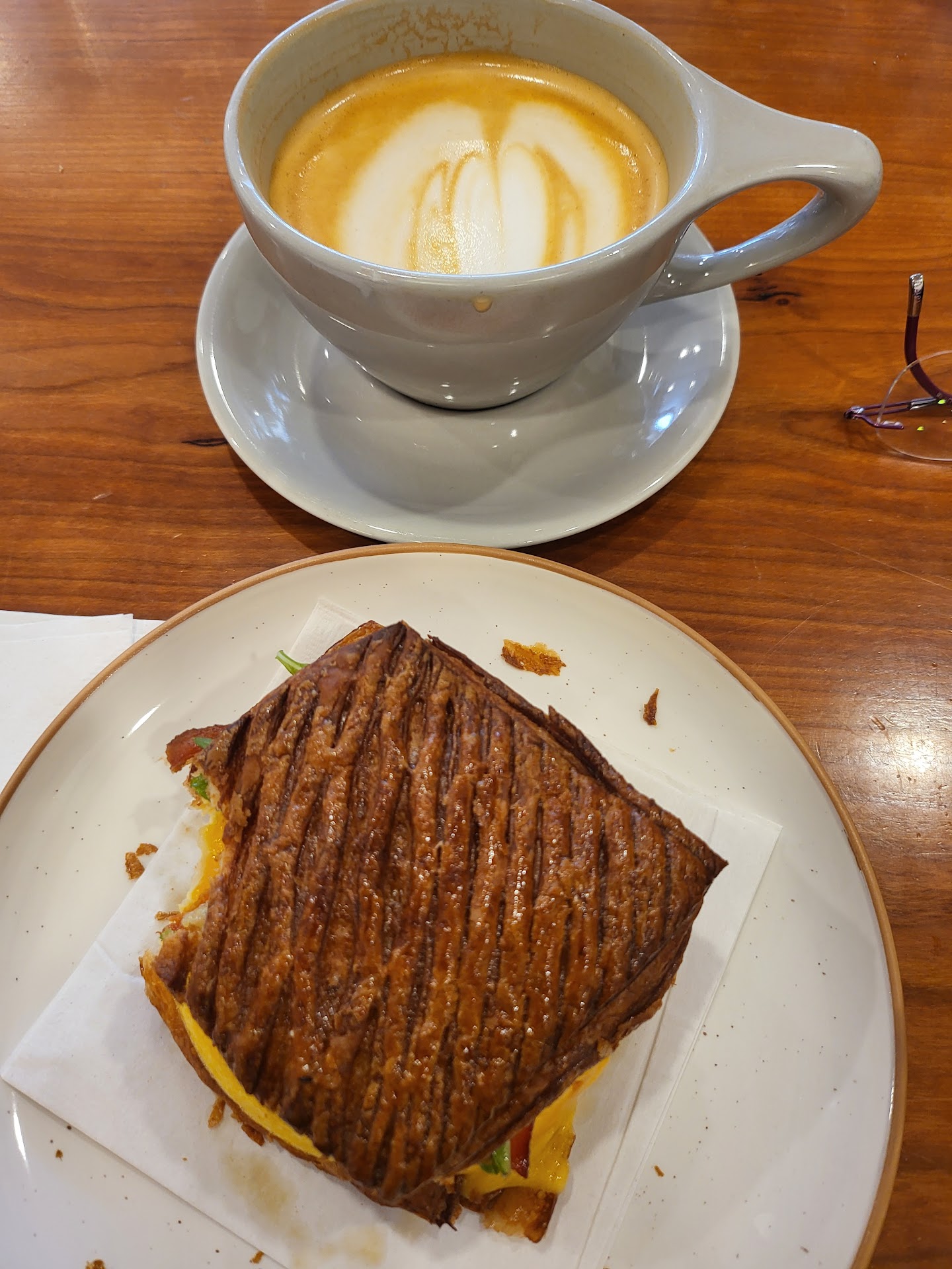 Read moreOn a Monday mid-morning, I stopped in for a hot breve latte and a breakfast sandwich. The vibe was relaxing since it wasn't packed, but had the typical coffee shop hum. The coffee was perfectly made and full of rich flavor. (Finally, a place that serves well-roasted espresso, not bitter, burnt beans!) For the locals, they do use Hildebrand diary products, so the flavor/quality of their dairy made drinks is excellent. After gazing at the mouth-watering pastries in the display case, I ordered a breakfast sandwich (see pic). I feel good about saying it was the best breakfast sandwich I have ever had (and I've had quite a few over the years)! The egg was light and fluffy, the bacon crisp...all the flavors came together, and the croissant-like bun was delectable. This was my first visit to 1900 on Mass. I'll definitely return, and I highly recommend that you also make this one of your new...