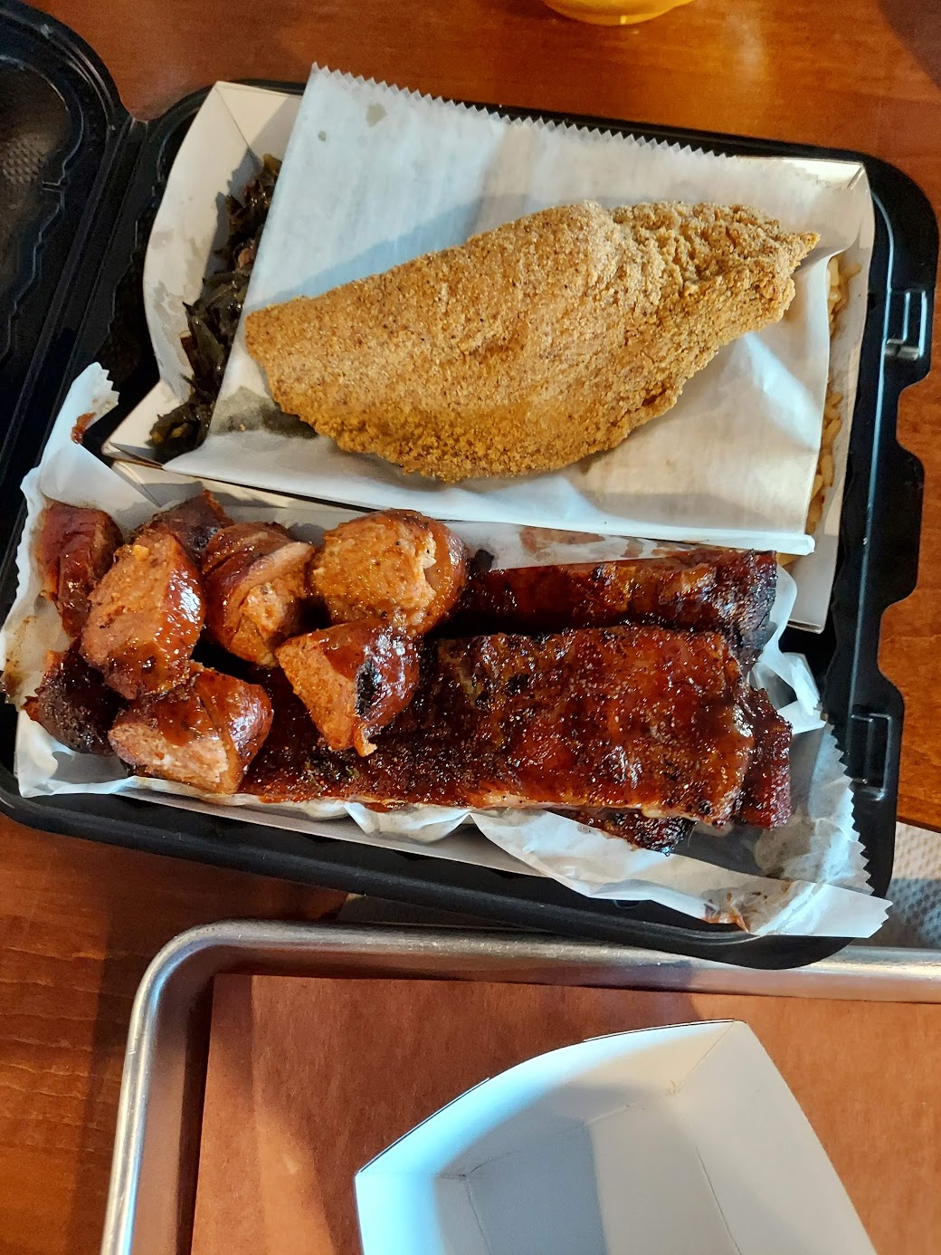 We went on a Friday night for dinner and were excited to try it out as we have had a lot of barbecue in other states and wanted to try a local place. We were the only diners initially and a woman came over to greet us. Not super friendly but informative. We ordered Cajun catfish bites to start, brisket for one dinner and brisket with pulled pork for the other. Both had sides of Cole slaw and beans with a piece of cornbread. We got drinks from the bar and waited for our starter to come. After 30 minutes I caught the serverâs attention and asked about the catfish bites. She kind of brushed me off and said they would be right out. There was only one other table of diners and their starter had already come out. Ten more minutes passed and the cook walked by. I asked him about the starter and he said it was probably put in with the dinner order and he would get it right out. I told him I do not like the starter and dinner to come out the same time ( hence the name âstarterâ) and he said it would be no problem.