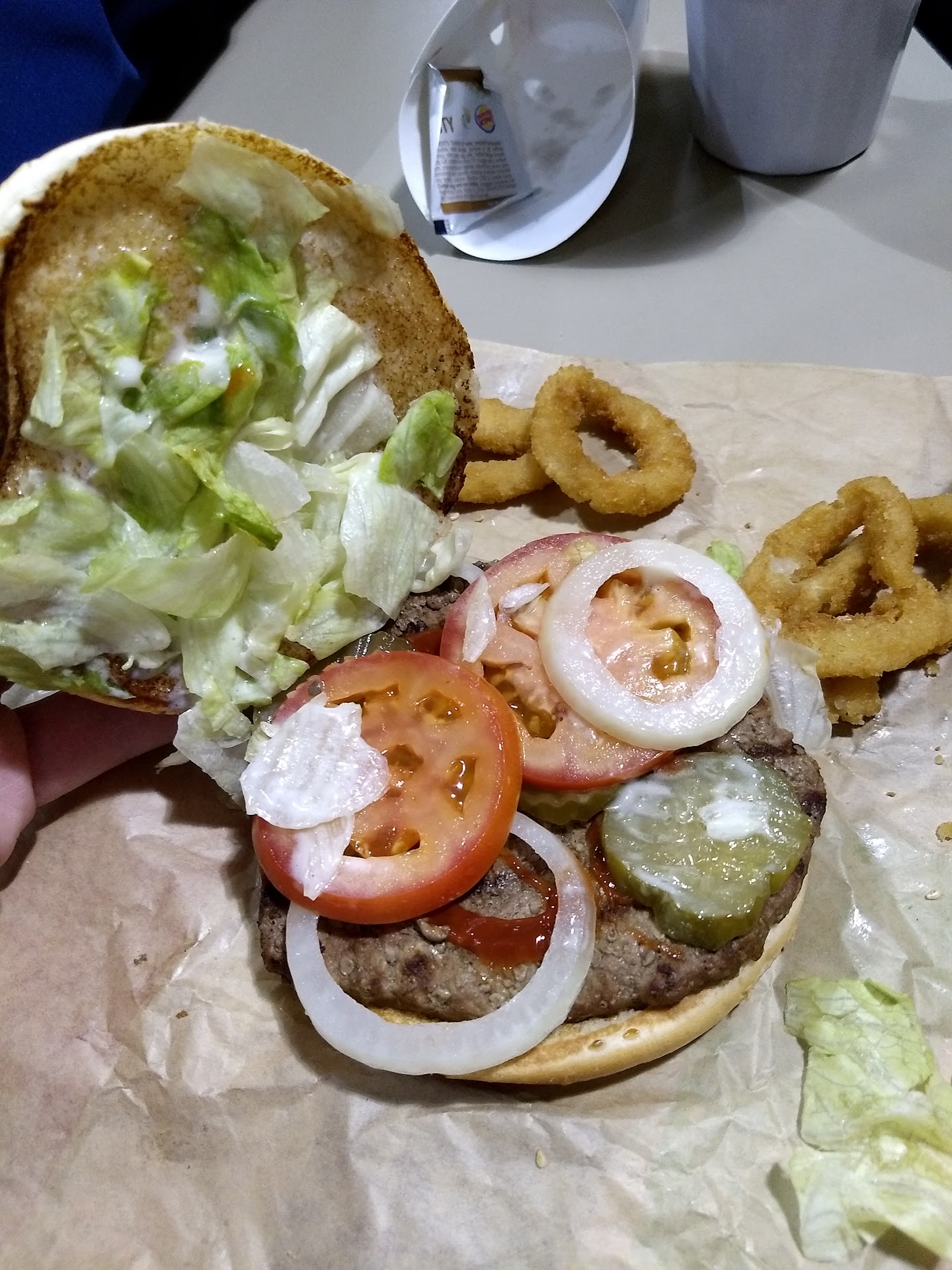 When I got home (after explaining to my wife everything that had happened), we took the food out of the bag and were not happy... her 'Whopper Jr' was: 1) smaller than my double cheeseburger (it looked like a slider, to be honest), 2) had extra onion (when I asked for light-condiments), and had no cheese (I specifically asked for cheese). I also did not get a receipt so I cannot take the survey or refer to it for sales info.