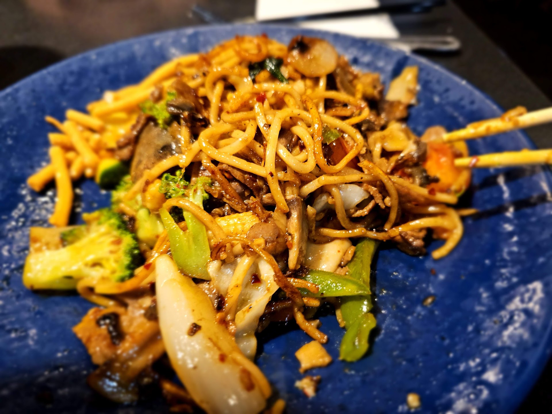 Read moreWell, bff suggested this place and I agreed. First, bff gave me the wrong directions 🙄 but after she said "wrong directions" all was good! So I arrive and walk in. The place is kind of dark and I'm not sure what these murals are about (please clue me in and see photo). The server/host points you to a table and off you go! We're there for the lunch buffet. Your server will bring you a drink and explain how to fetch your own lunch. Arrive at the buffet and man, it's intimidating. Loads and loads of options (and quite frankly I'm not a fan of buffets because I'm a germaphobic) but I move on with a grimace. Mushrooms, bean sprouts, carrots, chicken, pork, Asian meatballs, spinach, zucchini, Tomatoes, lots of noodle choices too. Too many to mention but all the choices were fresh and I saw they were replenished with an employee who had gloves (yay). I load my bowl and set it on the Circular grill. Chef picks it up and tosses it on with a sizzle. Seriously, this guy moves so many dishes around on the wheel it's amazing! When yours is done, it's plated and off you go! There are many, many sauces to choose from. I chose a "burn the village" which apparently would make me want a fire extinguisher. I'm a hot-n-heimer so bring on the burn. It was fantastic. The buffet has a detailed menu as well as a helpful list of what sauces are mild to hot. Service is attentive so please, while it's buffet, tip well. Bathroom was a bit grotty. I'll...