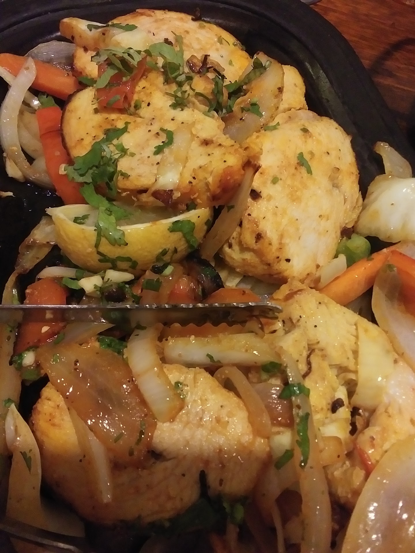 We ordered the Lamb Rogan Josh ($14.95): tender morsels of lamb cooked in an onion sauce with yogurt, nuts, and a unique blend of spices and coriander; Sag Paneer ($11.95): simmered with fresh spinach cooked with homemade cheese and spices; and Beef Curry ($12.95); succulent pieces of beef cooked in thick curry sauce with herbs, all accompanied by large servings of bismati (white) rice. I asked the server if they had pilau rice, my favorite, a kind of Indian fried rice with peas, onions, and other vegetables and spices, much more flavorful than the bismati rice we received, but unnecessary because the rice is quickly covered with the entrees when consumed.