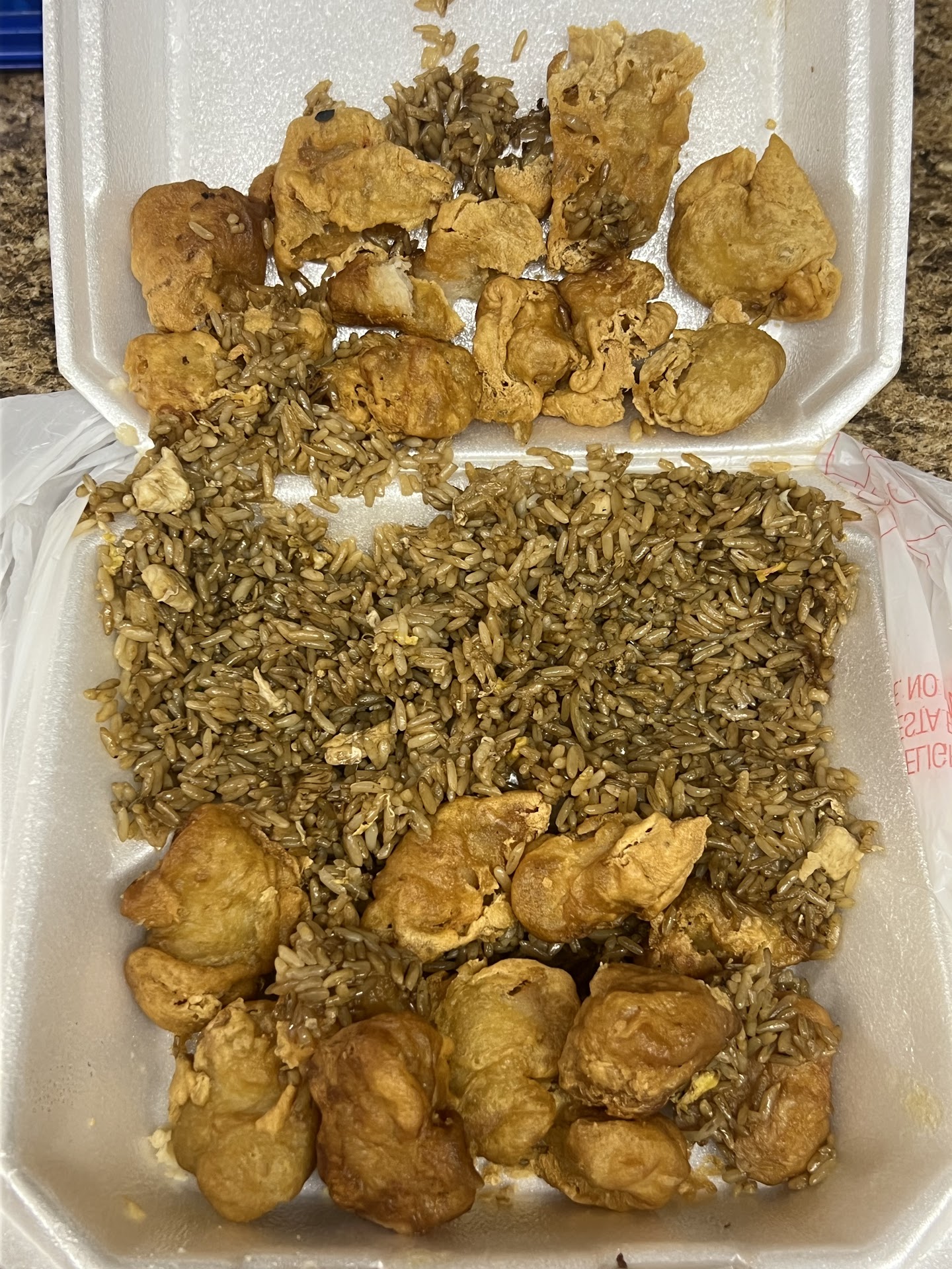 This meal was extremely disappointing, after paying almost $17 for the food alone and then tipping $4 for what I thought was good service I feel bamboozled. I believe my entire meal was an old meal from a previous day. The chicken was OVERCOOKED and very displeasing to the eye. Truthfully they look like dried up chitterlings. The fried rice was extra fried and greasy. The egg roll that came with the meal was GREASY and SOGGY. The sweet and sour sauce was like jello and lumpy, which is odd because that is not the consistency of sauce. The only thing I was pleased with and ate was the shrimp egg roll which was still greasy because it came fresh out the grease, but they are now making larger egg rolls I noticed since Foon Yings reopened their establishment.