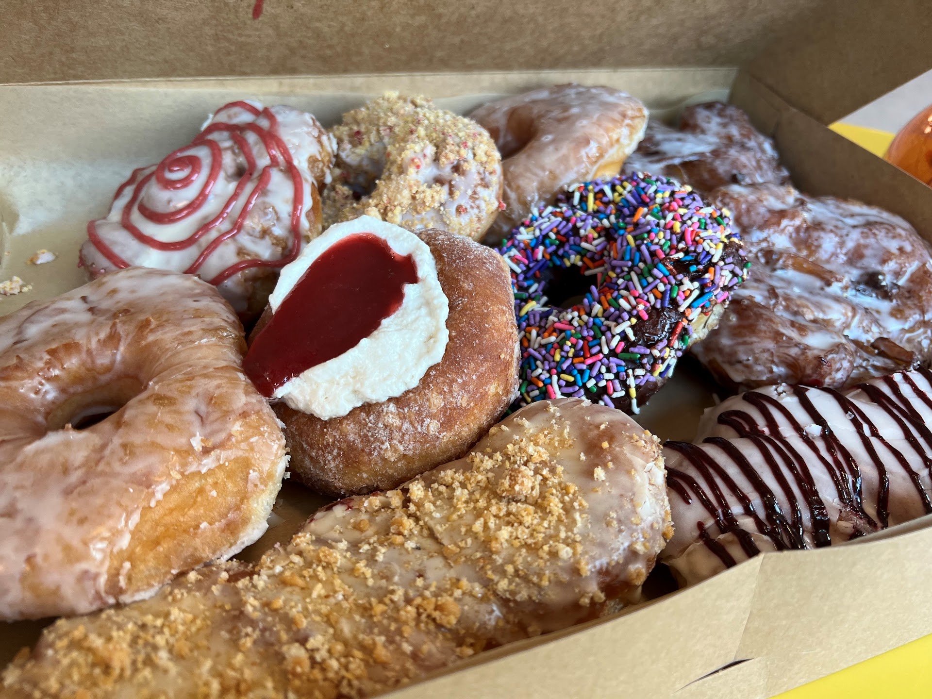 In our box: ORIGINAL VANILLA GLAZED RING DARK CHOCOLATE + SPRINKLES VANILLA + STRAWBERRY CORNBREAD CRUMBS MAPLE - BROWN BUTTER TWIST GUAVA GLAZED + BLUEBERRY JAM TWIST HONEY GLAZED + RASPBERRY JAM CLUSTER WILD PLUM AND HONEY FLUFF LOCAL...