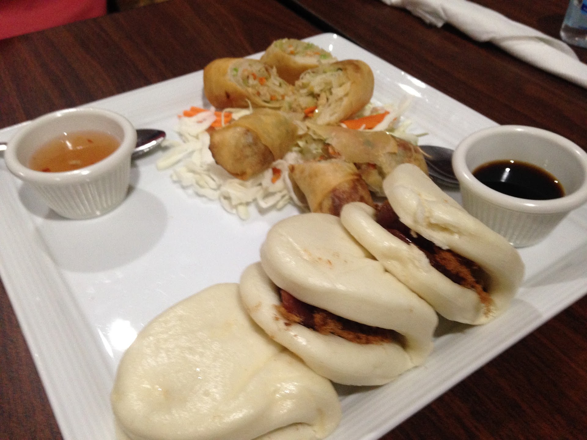 After taking our order, our server indicated that "everything" would be out shortly, but if you know me, you know I detest entrees arriving before the appetisers have been finished. I asked her to please hold the entrees until we had finished our starters, to which she readily agreed. The steamed buns (3) were OK even though the steamed whole wheat buns were not even baked. They had an odd look and texture (like eating raw bread dough) and were too big for the tiny dipping cups, but the flavor was decent. Not something we would order again. The spring rolls were good and a decent value at $4.25. The dipping sauces came in teeny weeny cups, too small even for the fried spring rolls which were not that big to begin with.